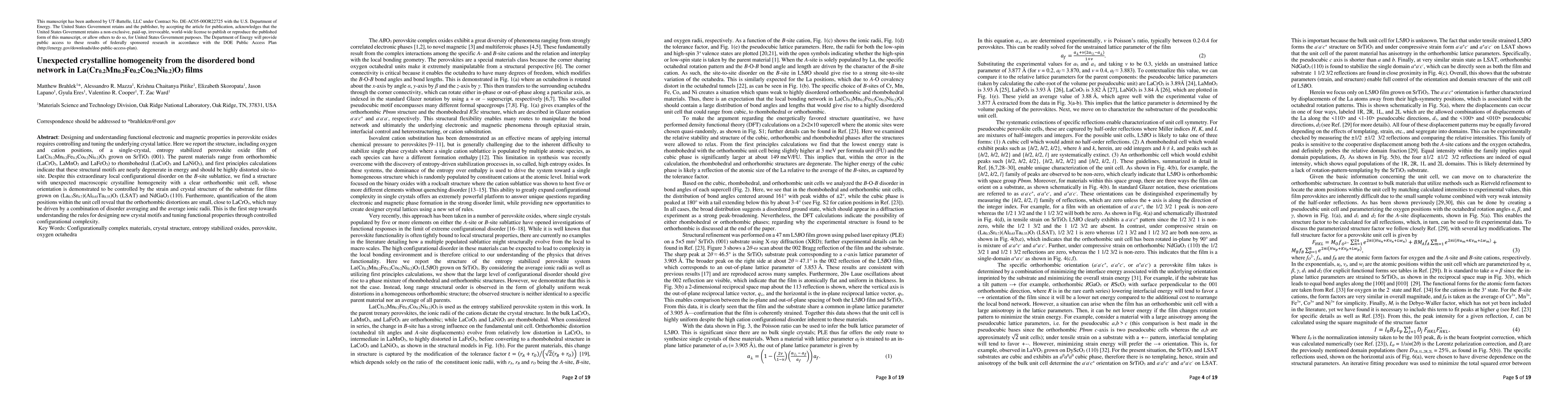 This paper investigates the structure of a perovskite oxide film La(Cr0.2Mn0.2Fe0.2Co0.2Ni0.2)O3, revealing unexpected macroscopic crystalline homogeneity despite significant local disorder in the B-site sublattice. The study highlights the role of substrate strain and crystal structure in controlling the film's orientation and suggests that disorder averaging and average ionic radii contribute to the observed orthorhombic distortions.
