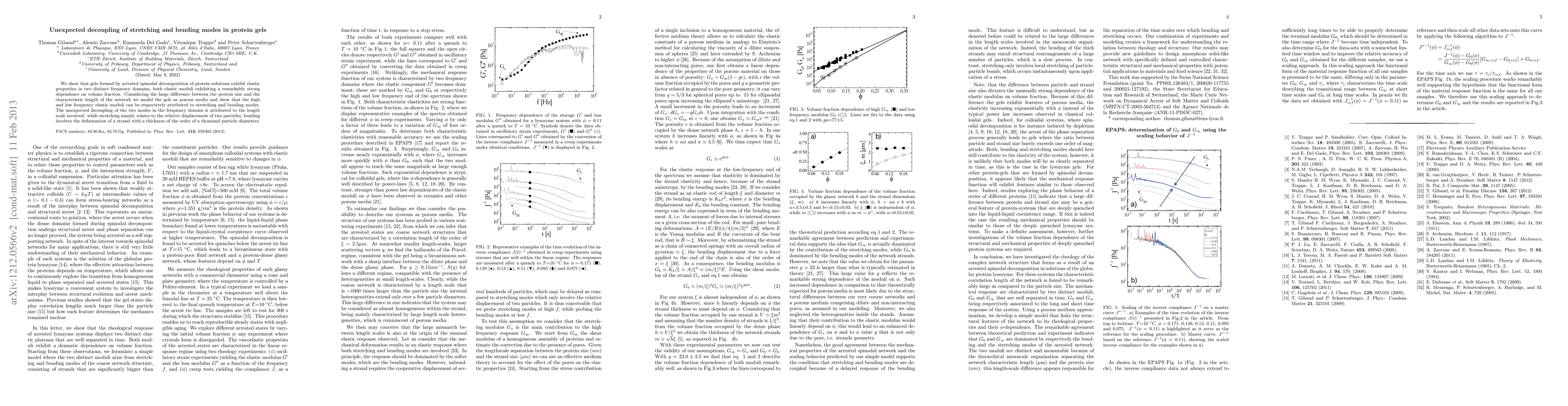 Summary: Protein gels formed via arrested spinodal decomposition show distinct elastic properties in two frequency domains, with moduli dependent on volume fraction. The decoupling between stretching and bending modes is due to differing length scales, with stretching related to particle displacement and bending to strand deformation.