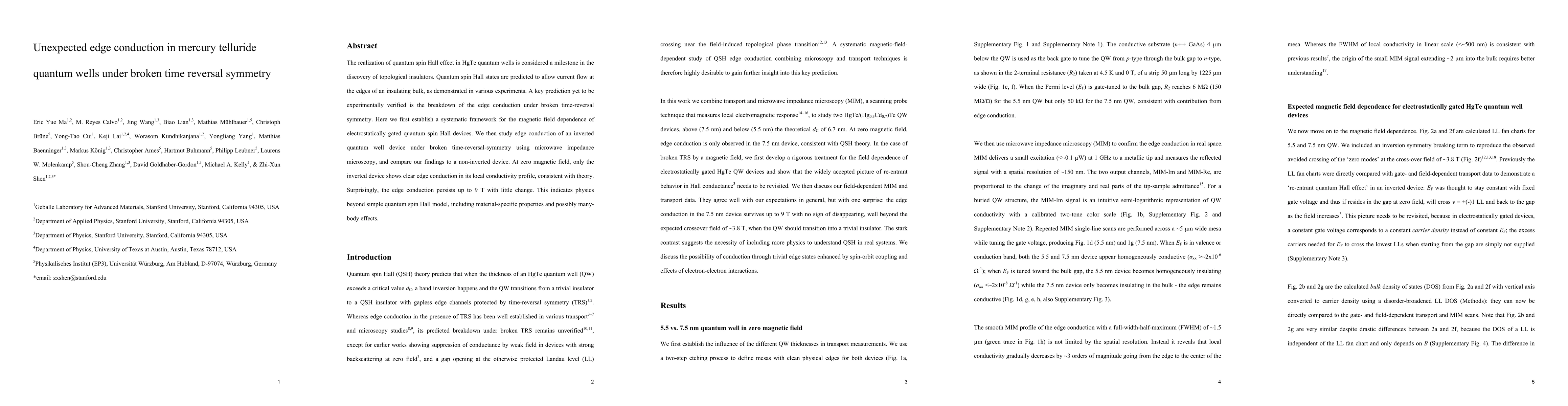 This paper reports unexpected edge conduction in HgTe quantum wells under broken time reversal symmetry, challenging conventional quantum spin Hall effect models. Using cryogenic microwave impedance microscopy, the study finds persistent edge conduction in a 7.5 nm HgTe QW despite strong magnetic fields, suggesting additional material-specific factors at play.