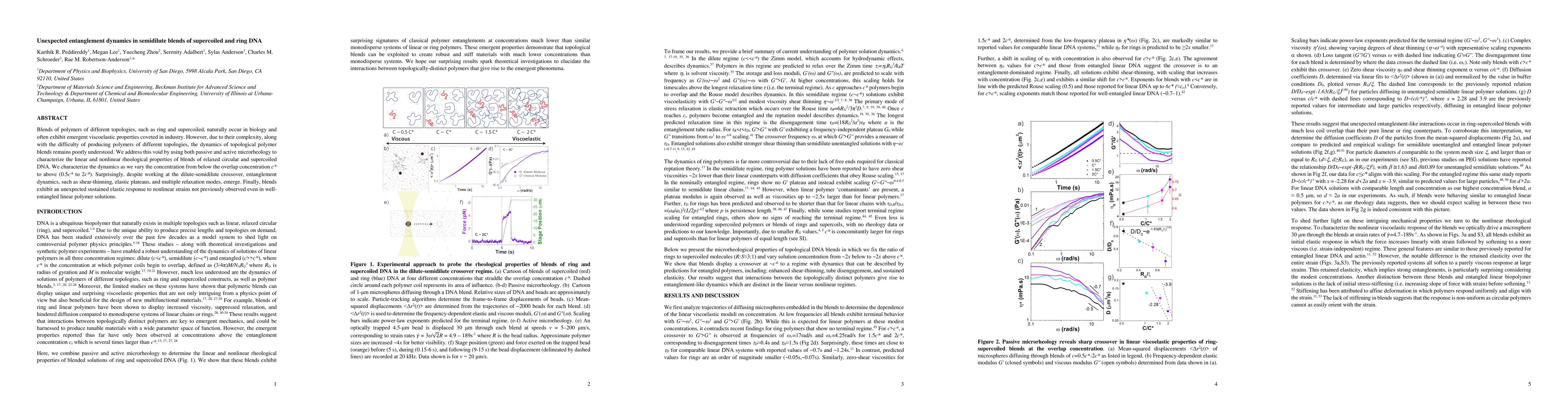 This study investigates the entanglement dynamics in semidilute blends of ring and supercoiled DNA, revealing unexpected viscoelastic behavior and sustained elastic response to nonlinear strains, despite being at the dilute-semidilute crossover. The findings highlight the complex rheological properties of topological polymer blends.