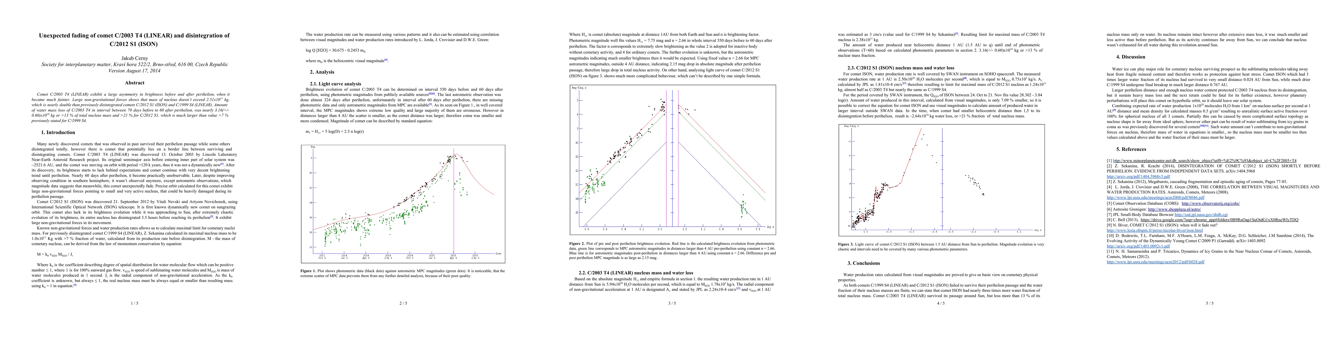 Comet C/2003 T4 (LINEAR) significantly faded post-perihelion, with mass loss of over 13% of its nucleus, while C/2012 S1 (ISON) also experienced substantial disintegration, highlighting greater water mass loss compared to previous comets.