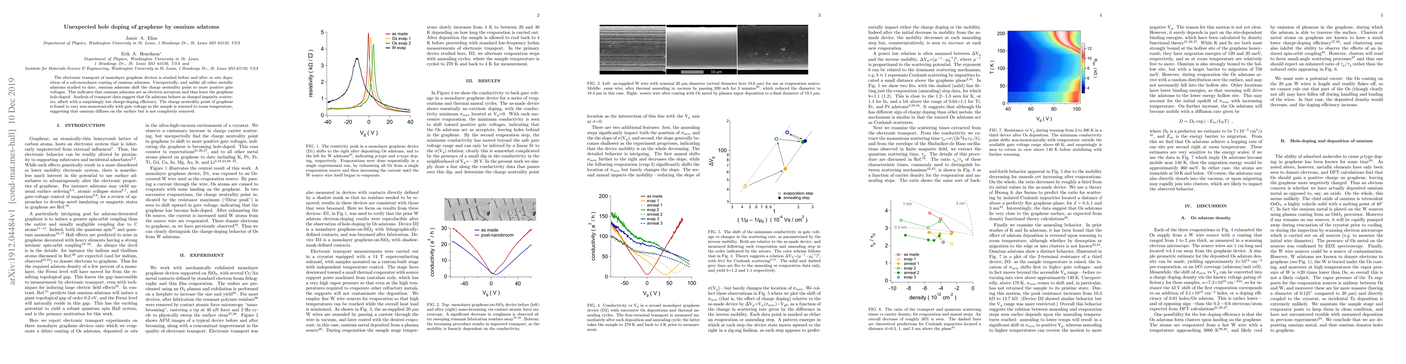 The study reveals that osmium adatoms unexpectedly induce hole doping in graphene, shifting its charge neutrality point to more positive gate voltages, unlike other metallic adatoms. Osmium acts as electron acceptors, functioning as low-efficiency charged impurity scatterers, and its diffusion on the graphene surface is observed as the sample warms to room temperature.