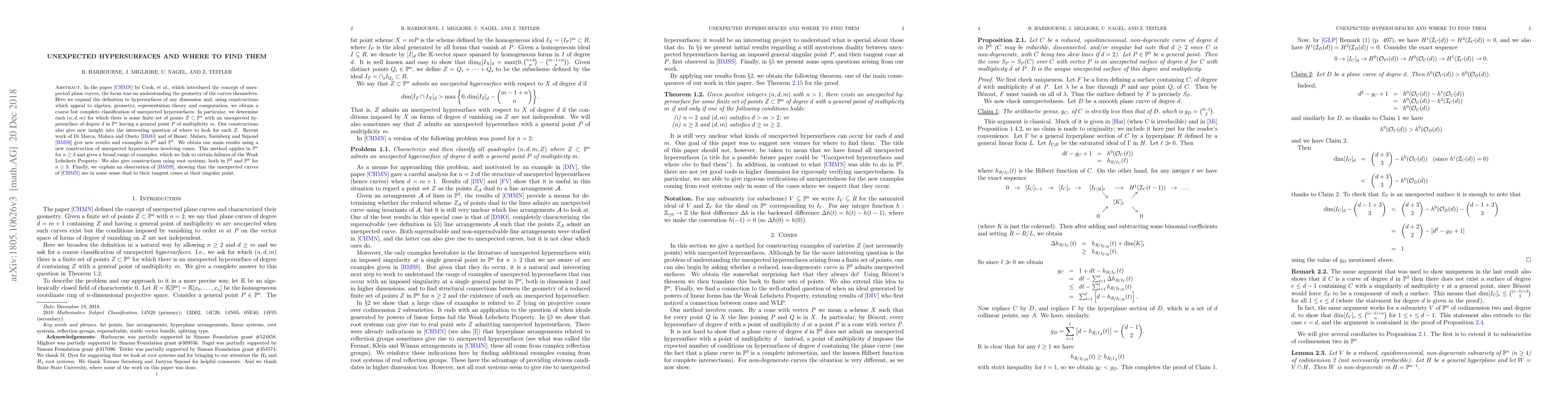 In a recent paper by Cook, et al., which introduced the concept of unexpected plane curves, the focus was on understanding the geometry of the curves themselves. Here we expand the definition to hypersurfaces of any dimension and, using constructions which appeal to algebra, geometry, representation theory and computation, we obtain a coarse but complete classification of unexpected hypersurfaces. In particular, we determine each $(n,d,m)$ for which there is some finite set of points $Z\subset\mathbb P^n$ with an unexpected hypersurface of degree $d$ in $\mathbb P^n$ having a general point $P$ of multiplicity $m$. Our constructions also give new insight into the interesting question of where to look for such $Z$. Recent work of Di Marca, Malara and Oneto \cite{DMO} and of Bauer, Malara, Szemberg and Szpond \cite{BMSS} give new results and examples in $\mathbb P^2$ and $\mathbb P^3$. We obtain our main results using a new construction of unexpected hypersurfaces involving cones. This method applies in $\mathbb P^n$ for $n \geq 3$ and gives a broad range of examples, which we link to certain failures of the Weak Lefschetz Property. We also give constructions using root systems, both in $\mathbb P^2$ and $\mathbb P^n$ for $n \geq 3$. Finally, we explain an observation of \cite{BMSS}, showing that the unexpected curves of \cite{CHMN} are in some sense dual to their tangent cones at their singular point.