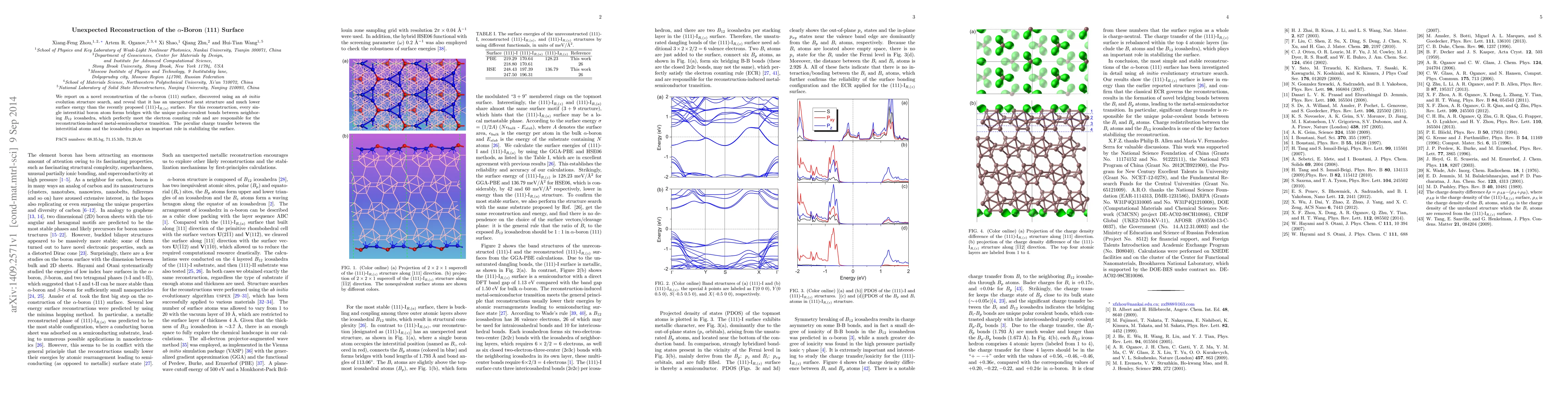 This paper reports on an unexpected reconstruction of the alpha-boron (111) surface with a lower surface energy than previously proposed structures, characterized by interstitial boron atoms forming bridges with polar-covalent bonds between B_12 icosahedra, leading to a metal-semiconductor transition. The stabilization is attributed to unique charge transfer between interstitial atoms and the icosahedra.