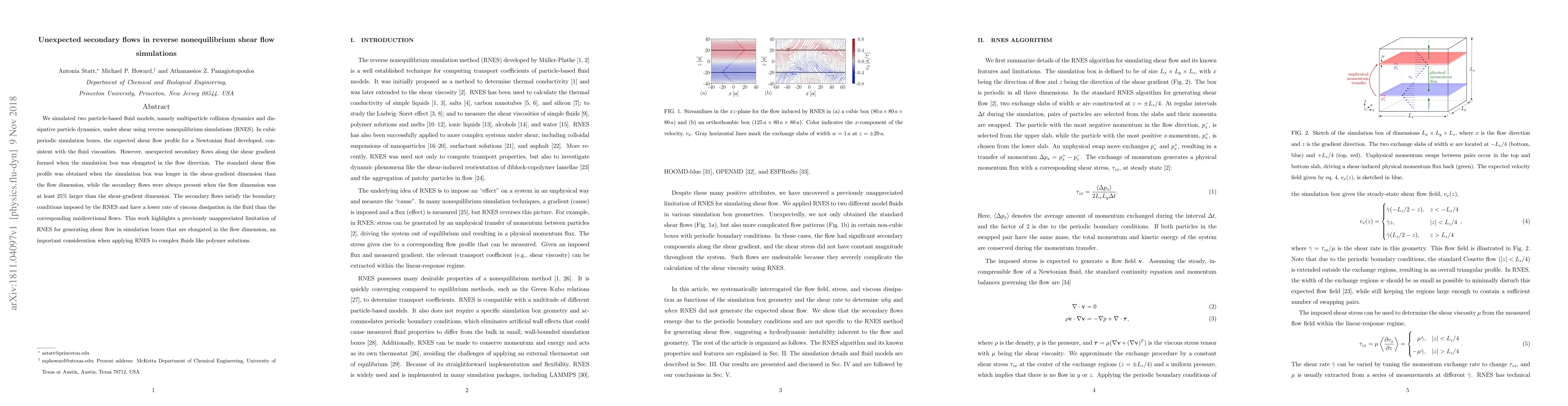 This study investigates secondary flows in reverse nonequilibrium shear flow simulations using particle-based fluid models. While expected shear flow profiles formed under standard conditions, unexpected secondary flows emerged when the simulation box was elongated in the flow direction, indicating a limitation of the method for non-standard geometries.