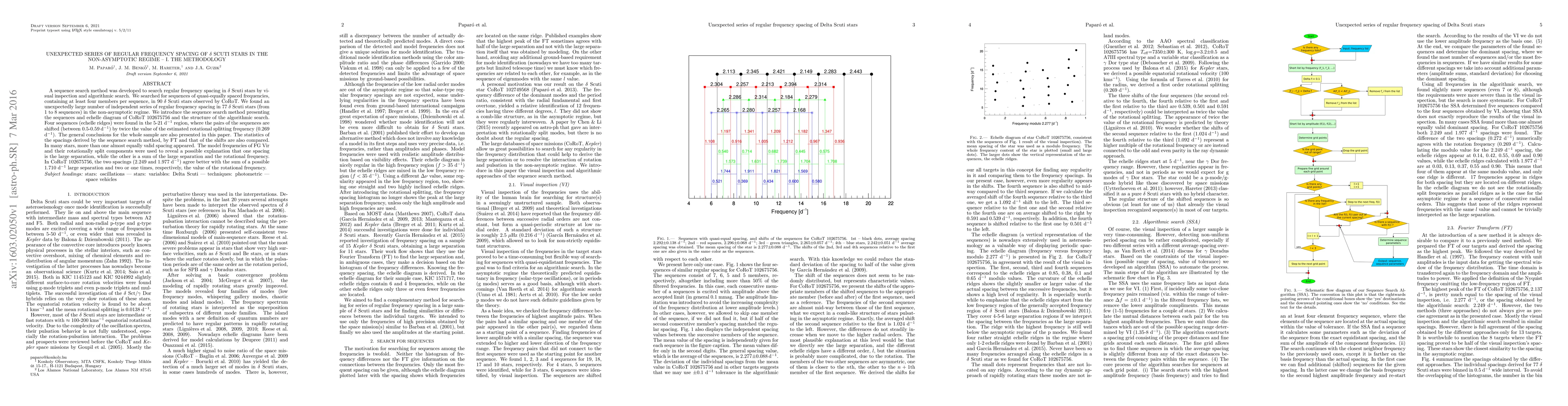 This paper introduces a sequence search method to identify regular frequency spacings in delta Scuti stars, revealing an unexpectedly large number of such sequences in 77 stars. The study suggests that these spacings may be explained by the large separation and rotational frequency components.