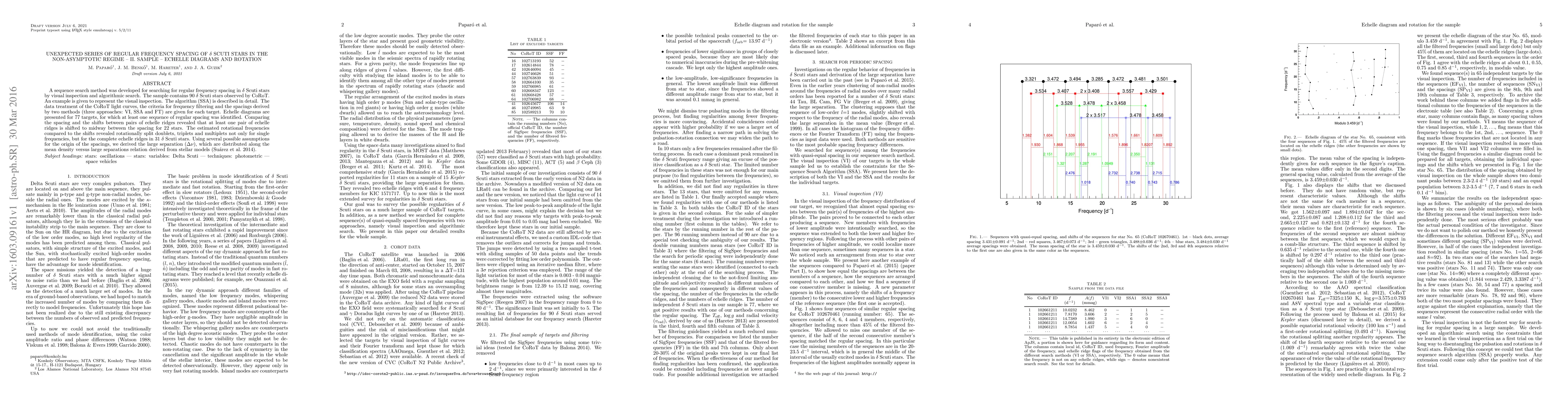 A sequence search method was developed for searching for regular frequency spacing in delta Scuti stars by visual inspection and algorithmic search. The sample contains 90 delta Scuti stars observed by CoRoT. An example is given to represent the visual inspection. The algorithm (SSA) is described in detail. The data treatment of the CoRoT light curves, the criteria for frequency filtering and the spacings derived by two methods (three approaches: VI, SSA and FT) are given for each target. Echelle diagrams are presented for 77 targets, for which at least one sequence of regular spacing was identified. Comparing the spacing and the shifts between pairs of echelle ridges revealed that at least one pair of echelle ridges is shifted to midway between the spacing for 22 stars. The estimated rotational frequencies compared to the shifts revealed rotationally split doublets, triplets and multiplets not only for single frequencies, but for the complete echelle ridges in 31 delta Scuti stars. Using several possible assumptions for the origin of the spacings, we derived the large separation ($\Delta\nu$), which are distributed along the mean density versus large separations relation derived from stellar models Suarez 2014.