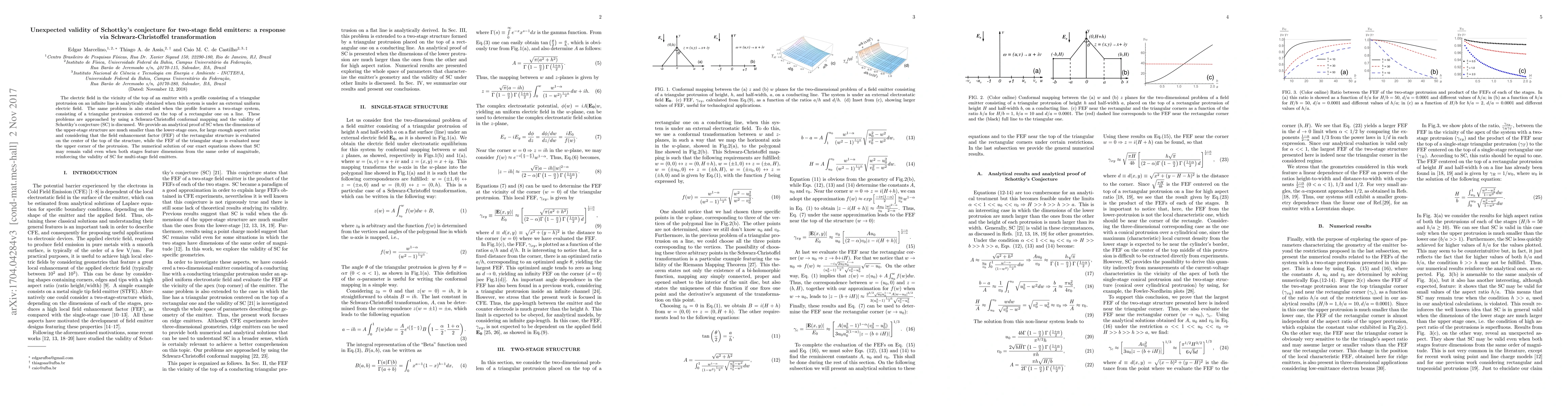 The electric field in the vicinity of the top of an emitter with a profile consisting of a triangular protrusion on an infinite line is analytically obtained when this system is under an external uniform electric field. The same problem is also studied when the profile features a two-stage system, consisting of a triangular protrusion centered on the top of a rectangular one on a line. These problems are approached by using a Schwarz-Christoffel conformal mapping, and the validity of Schottky's conjecture (SC) is discussed. The authors provide an analytical proof of SC when the dimensions of the upper-stage structure are much smaller than those of the lower-stage structure, for large enough aspect ratios and considering that the field enhancement factor (FEF) of the rectangular structure is evaluated on the center of the top of the structure, while the FEF of the triangular stage is evaluated near the upper corner of the protrusion. The numerical solution of our exact equations shows that SC may remain valid even when both stages feature dimensions of the same order of magnitude, reinforcing the validity of SC for multistage field emitters.