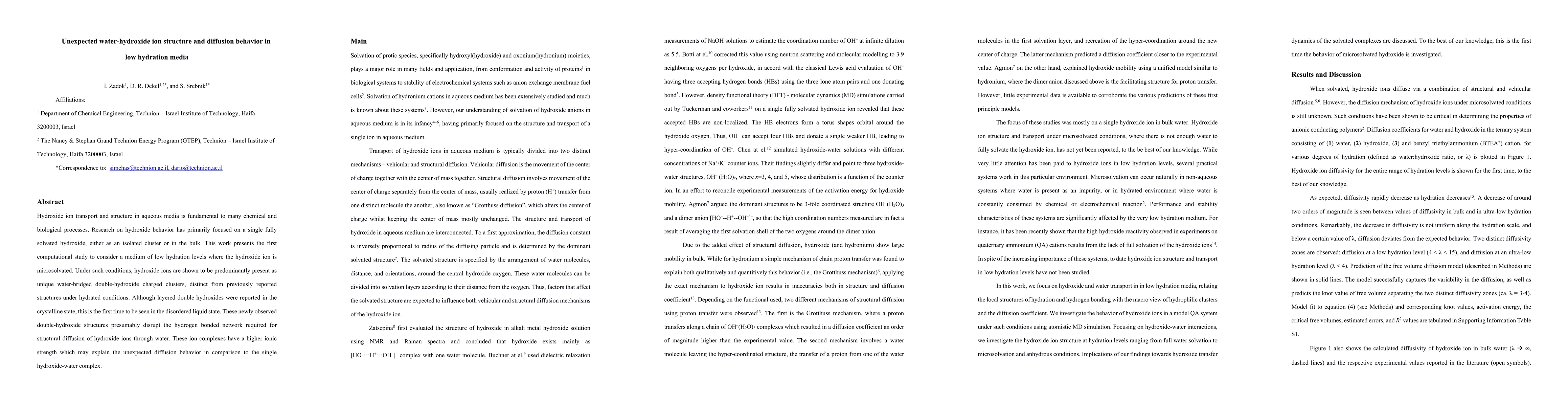 This study reveals unique water-bridged double-hydroxide clusters in low hydration media, differing from fully solvated hydroxide ions. These structures disrupt the hydrogen-bonded network, leading to unexpected diffusion behavior compared to single hydroxide-water complexes.