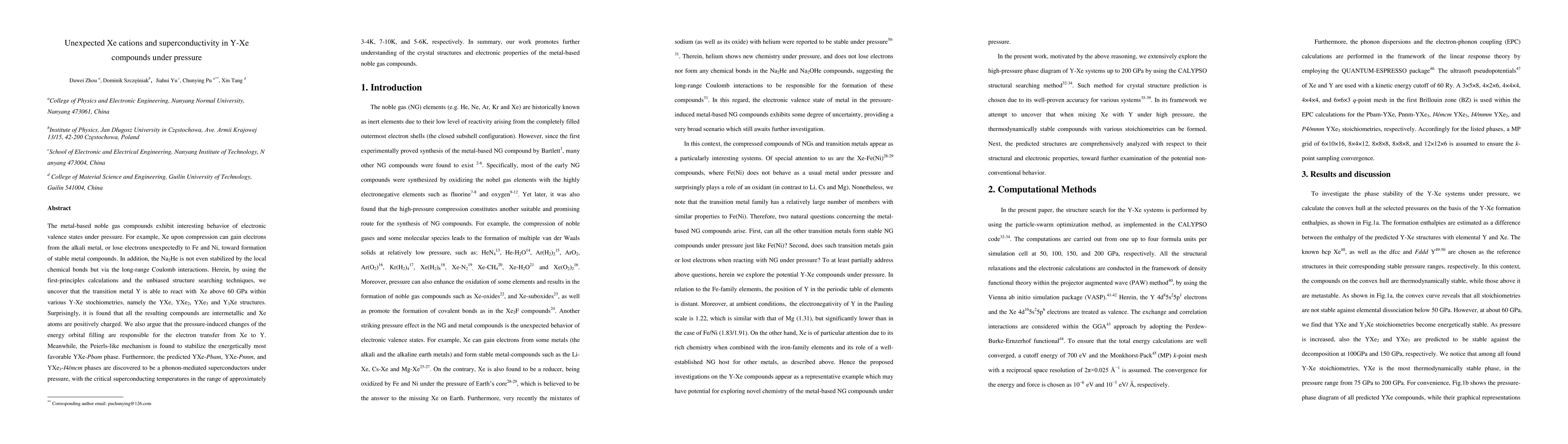 The metal-based noble gas compounds exhibit interesting behavior of electronic valence states under pressure. For example, Xe upon compression can gain electrons from the alkali metal, or lose electrons unexpectedly to Fe and Ni, toward formation of stable metal compounds. In addition, the Na2He is not even stabilized by the local chemical bonds but via the long-range Coulomb interactions. Herein, by using the first-principles calculations and the unbiased structure searching techniques, we uncover that the transition metal Y is able to react with Xe above 60 GPa within various Y-Xe stochiometries, namely the YXe, YXe2, YXe3 and Y3Xe structures. Surprisingly, it is found that all the resulting compounds are intermetallic and Xe atoms are positively charged. We also argue that the pressure-induced changes of the energy orbital filling are responsible for the electron transfer from Xe to Y. Meanwhile, the Peierls-like mechanism is found to stabilize the energetically most favorable YXe-Pbam phase. Furthermore, the predicted YXe-Pbam, YXe-Pnnm, and YXe3-I4/mcm phases are discovered to be phonon-mediated superconductors under pressure, with the critical superconducting temperatures in the range of approximately 3-4K, 7-10K, and 5-6K, respectively. In summary, our work promotes further understanding of the crystal structures and electronic properties of the metal-based noble gas compounds.