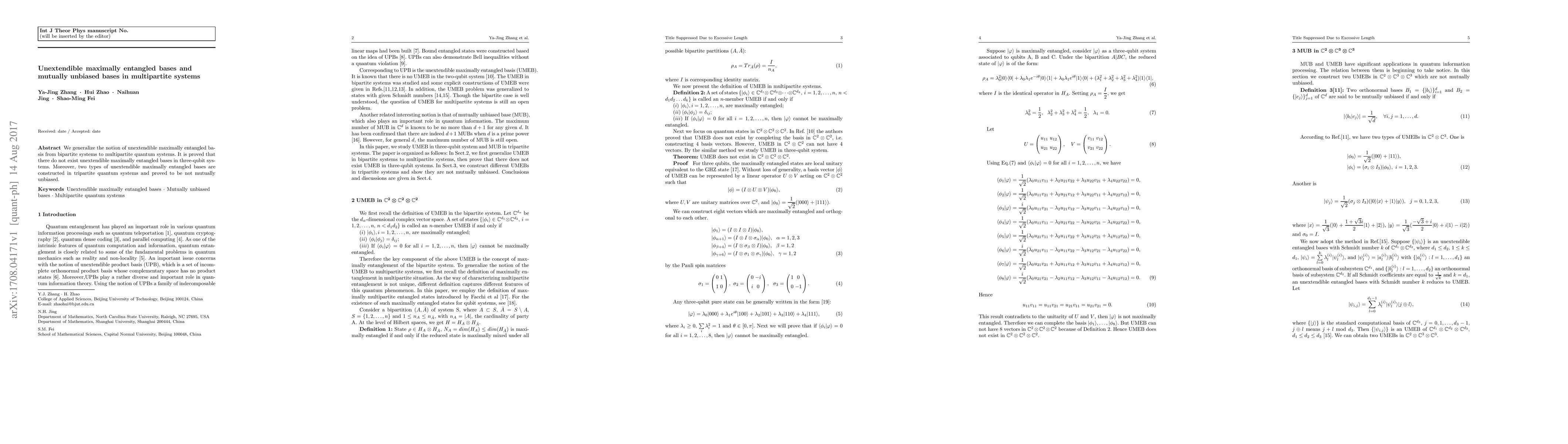 Summary: This paper extends the concept of unextendible maximally entangled bases to multipartite quantum systems, demonstrating the non-existence in three-qubit systems and constructing two types in tripartite systems, which are shown not to be mutually unbiased.