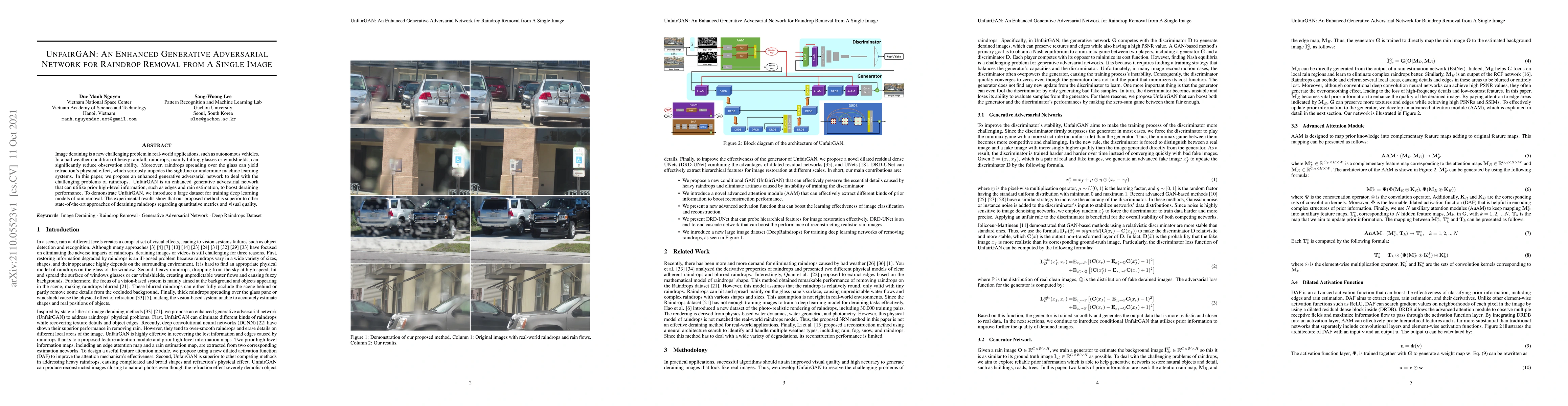 Title: UnfairGAN: An Enhanced Generative Adversarial Network for Raindrop Removal from A Single Image Summary: This paper proposes UnfairGAN, an advanced GAN that leverages high-level information to enhance raindrop removal from images, outperforming other methods in both quantitative metrics and visual quality. A new dataset is introduced for training and evaluating the model.