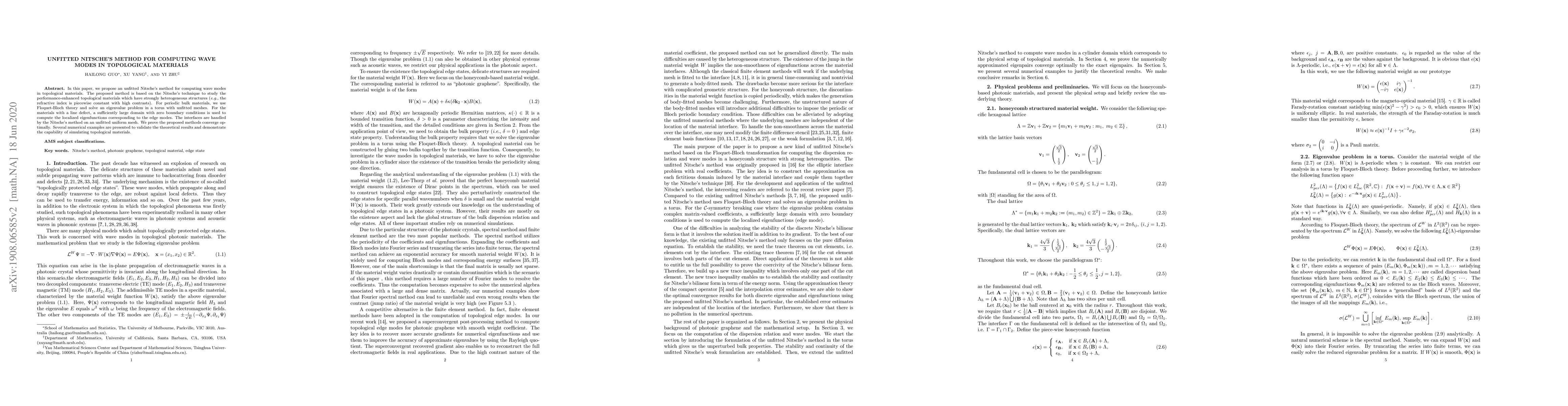 This paper proposes an unfitted Nitsche's method to compute wave modes in topological materials with strongly heterogeneous structures. The method uses Floquet-Bloch theory for periodic bulk materials and zero boundary conditions for materials with line defects, demonstrating optimal convergence and validated through numerical examples.