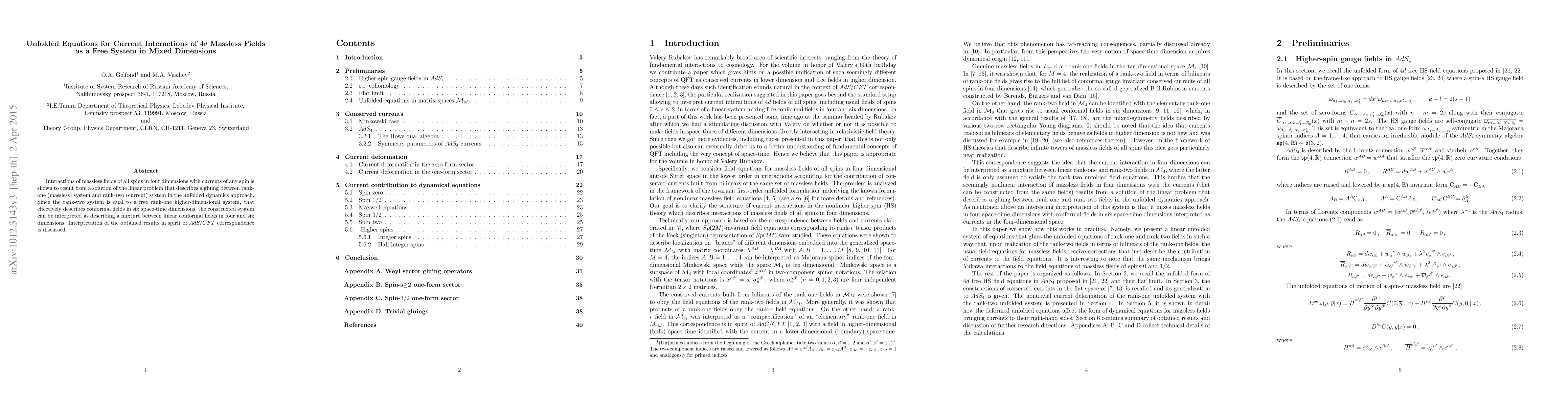 Interactions of massless fields of all spins in four dimensions with currents of any spin is shown to result from a solution of the linear problem that describes a gluing between rank-one (massless) system and rank-two (current) system in the unfolded dynamics approach. Since the rank-two system is dual to a free rank-one higher-dimensional system, that effectively describes conformal fields in six space-time dimensions, the constructed system can be interpreted as describing a mixture between linear conformal fields in four and six dimensions. Interpretation of the obtained results in spirit of AdS/CFT correspondence is discussed.
