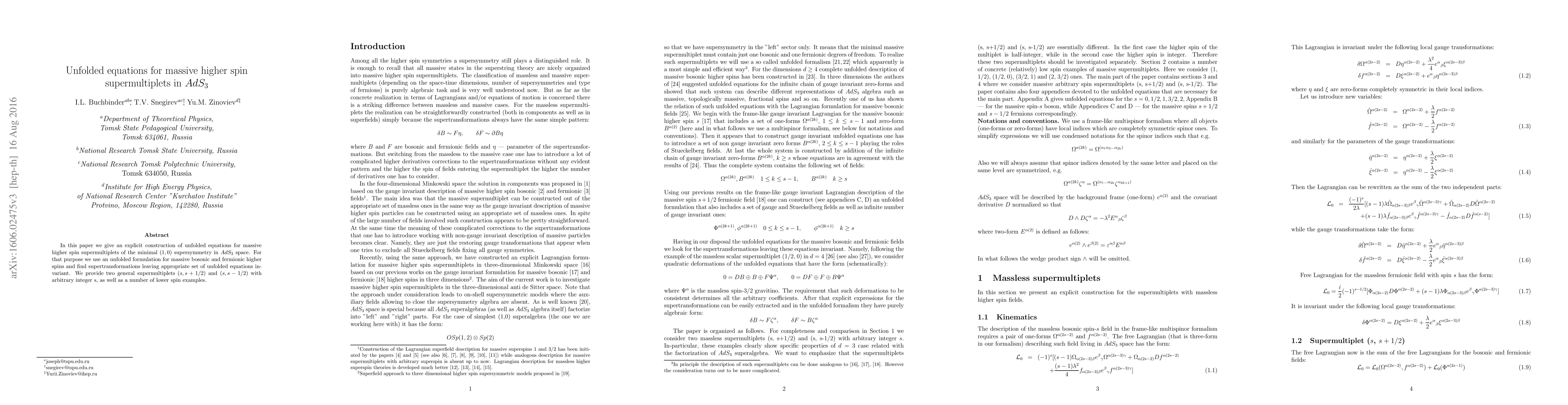 This paper constructs unfolded equations for massive higher spin supermultiplets in AdS_3, employing an unfolded formulation for both bosonic and fermionic higher spins. It provides two general supermultiplets (s, s+1/2) and (s, s-1/2) with arbitrary integer s, ensuring invariance under appropriate supertransformations.