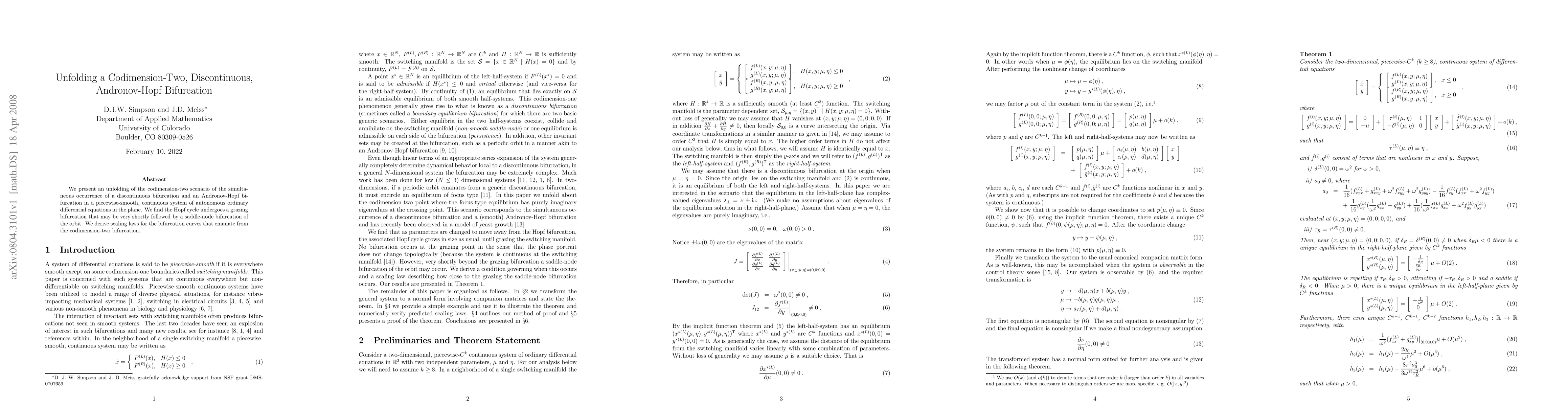 This paper explores a codimension-two bifurcation scenario involving a simultaneous discontinuous bifurcation and an Andronov-Hopf bifurcation in a piecewise-smooth system. It reveals a grazing bifurcation followed by a saddle-node bifurcation and derives scaling laws for the bifurcation curves.
