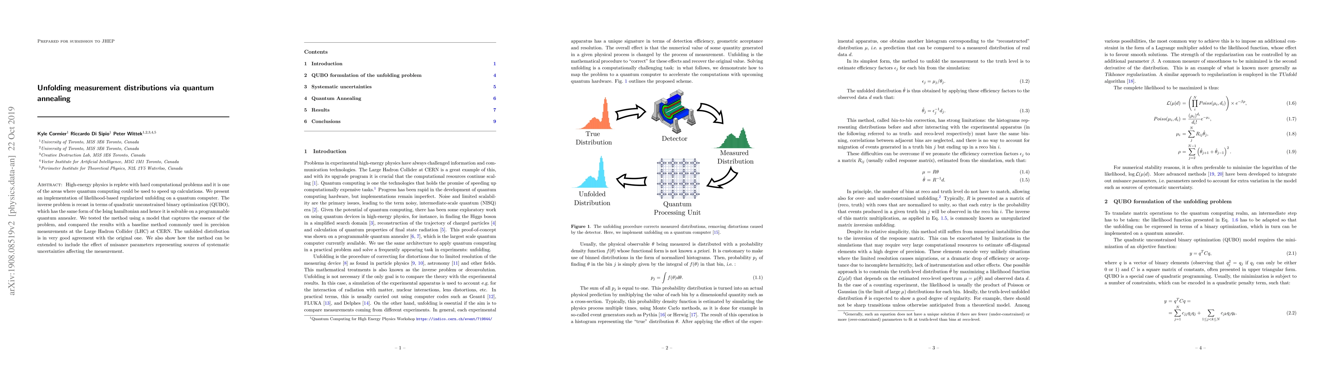 High-energy physics is replete with hard computational problems and it is one of the areas where quantum computing could be used to speed up calculations. We present an implementation of likelihood-based regularized unfolding on a quantum computer. The inverse problem is recast in terms of quadratic unconstrained binary optimization (QUBO), which has the same form of the Ising hamiltonian and hence it is solvable on a programmable quantum annealer. We tested the method using a model that captures the essence of the problem, and compared the results with a baseline method commonly used in precision measurements at the Large Hadron Collider (LHC) at CERN. The unfolded distribution is in very good agreement with the original one. We also show how the method can be extended to include the effect of nuisance parameters representing sources of systematic uncertainties affecting the measurement.