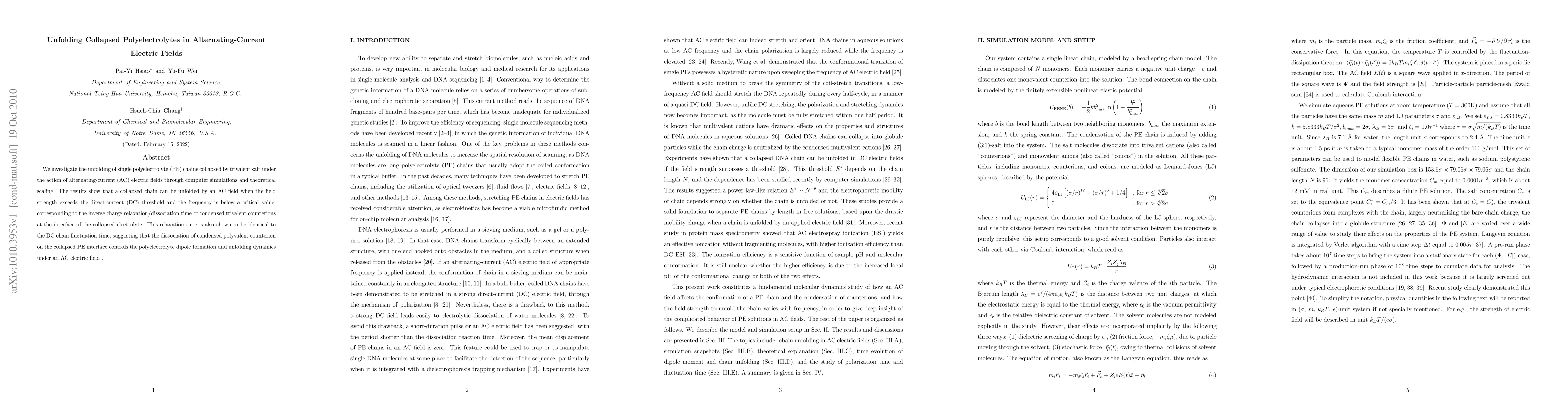 This paper explores the unfolding of collapsed polyelectrolyte chains in alternating-current (AC) electric fields, revealing that above a certain AC field strength and below a critical frequency, the chains can unfold. The dissociation time of trivalent counterions at the collapsed interface governs the unfolding dynamics, aligning with the direct-current (DC) chain fluctuation time.