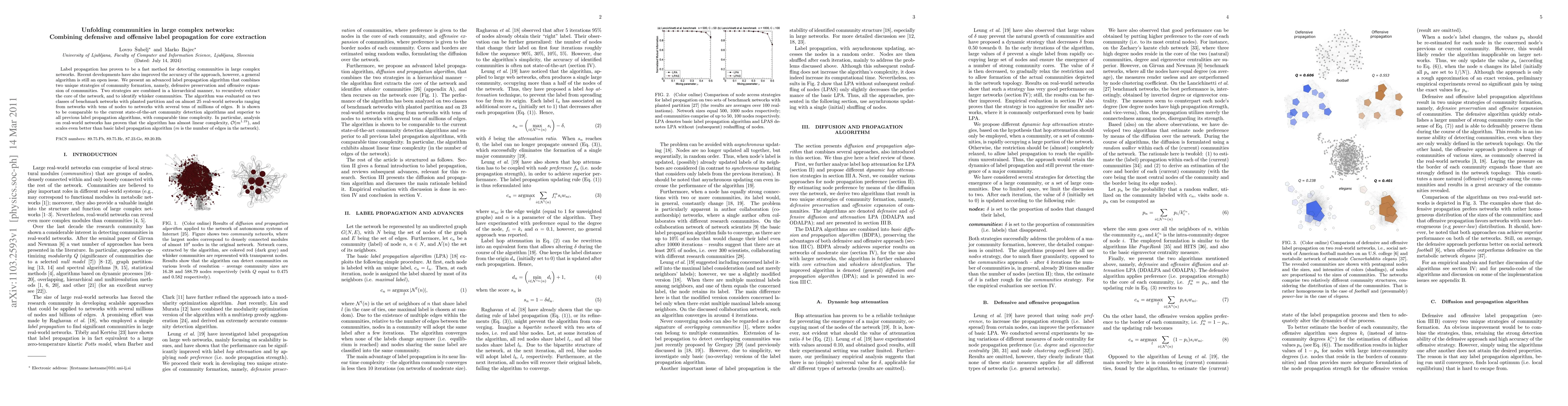 Label propagation has proven to be a fast method for detecting communities in large complex networks. Recent developments have also improved the accuracy of the approach, however, a general algorithm is still an open issue. We present an advanced label propagation algorithm that combines two unique strategies of community formation, namely, defensive preservation and offensive expansion of communities. Two strategies are combined in a hierarchical manner, to recursively extract the core of the network, and to identify whisker communities. The algorithm was evaluated on two classes of benchmark networks with planted partition and on almost 25 real-world networks ranging from networks with tens of nodes to networks with several tens of millions of edges. It is shown to be comparable to the current state-of-the-art community detection algorithms and superior to all previous label propagation algorithms, with comparable time complexity. In particular, analysis on real-world networks has proven that the algorithm has almost linear complexity, $\mathcal{O}(m^{1.19})$, and scales even better than basic label propagation algorithm ($m$ is the number of edges in the network).