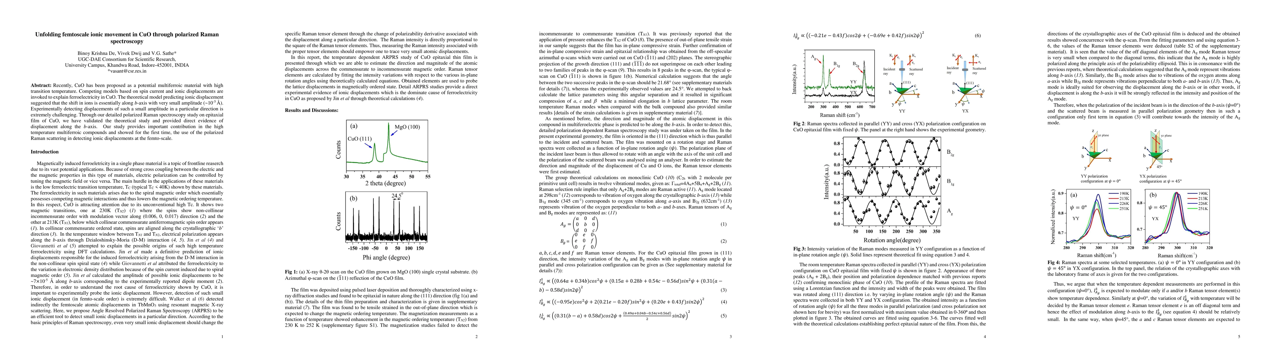 Recently, CuO has been proposed as a potential multiferroic material with high transition temperature. Competing models based on spin current and ionic displacements are invoked to explain ferroelectricity in CuO. The theoretical model predicting ionic displacement suggested that the shift in ions is essentially along b-axis with very small amplitude (~10-5 {\AA}). Experimentally detecting displacements of such a small amplitude in a particular direction is extremely challenging. Through our detailed polarized Raman spectroscopy study on epitaxial film of CuO, we have validated the theoretical study and provided direct evidence of displacement along the b-axis. Our study provides important contribution in the high temperature multiferroic compounds and showed for the first time, the use of the polarized Raman scattering in detecting ionic displacements at the femto-scale.