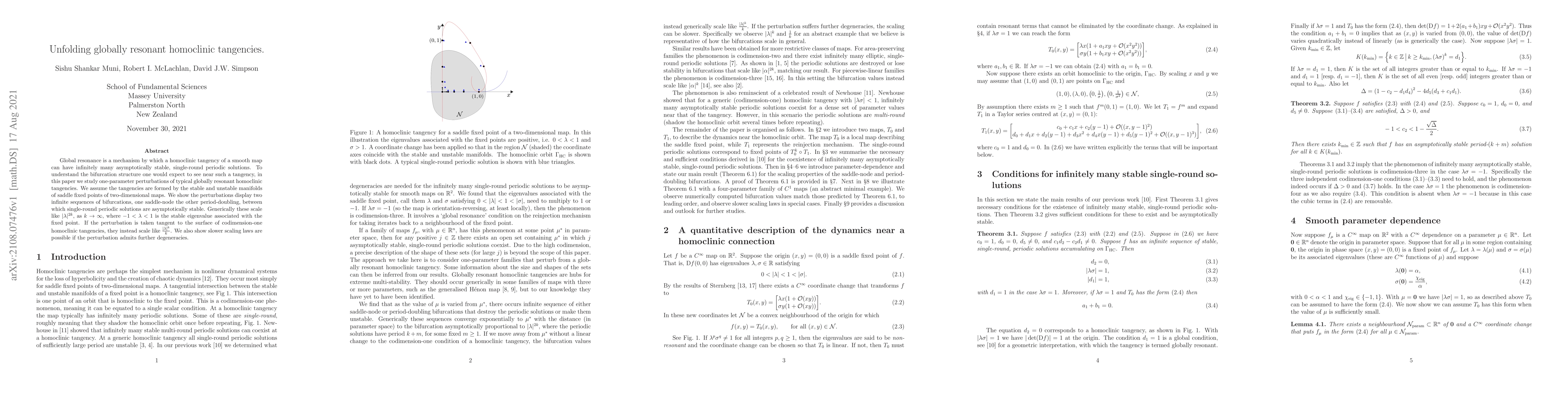 This paper explores the bifurcations near globally resonant homoclinic tangencies in two-dimensional maps, revealing two infinite sequences of bifurcations—saddle-node and period-doubling—that produce asymptotically stable periodic solutions. The scaling behaviors of these bifurcations depend on the perturbation's relationship to codimension-one tangencies.