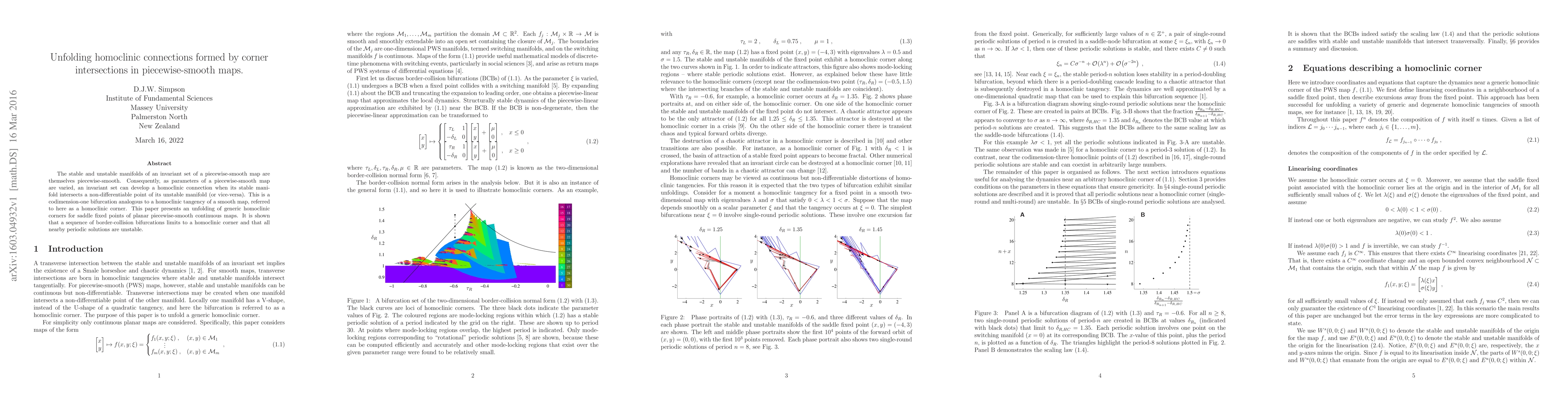 This paper explores the formation of homoclinic connections in piecewise-smooth maps through corner intersections, where stable and unstable manifolds meet at a non-differentiable point. It details the unfolding of generic homoclinic corners for saddle fixed points and demonstrates that these connections arise from a sequence of border-collision bifurcations, leading to unstable nearby periodic solutions.