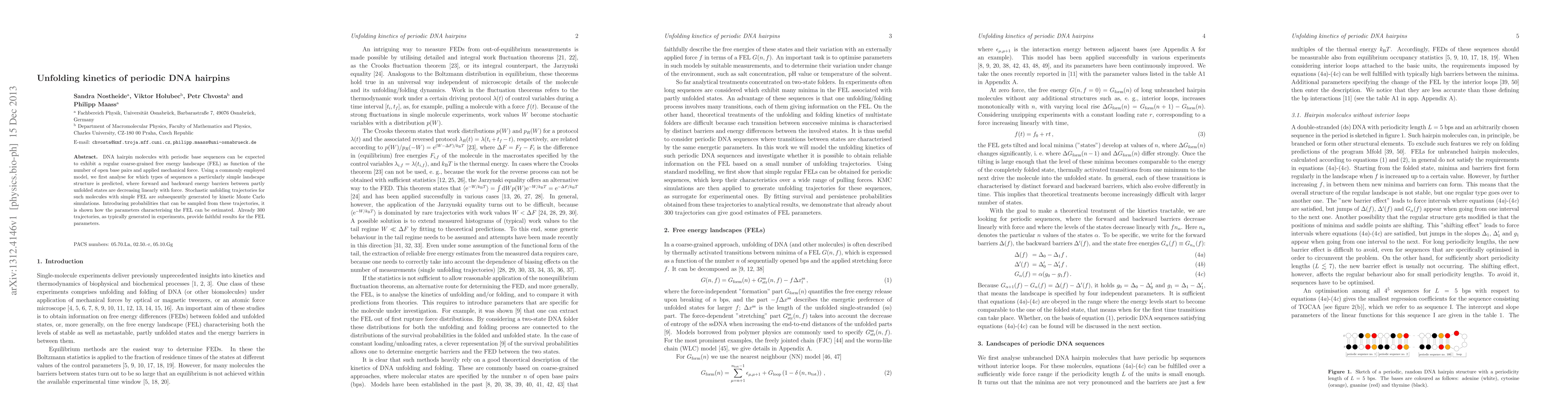 This paper investigates the unfolding kinetics of periodic DNA hairpins, predicting a simple free energy landscape where energy barriers decrease linearly with force. It uses kinetic Monte Carlo simulations to generate stochastic unfolding trajectories, demonstrating how parameters characterizing the landscape can be estimated from as few as 300 experimental trajectories.