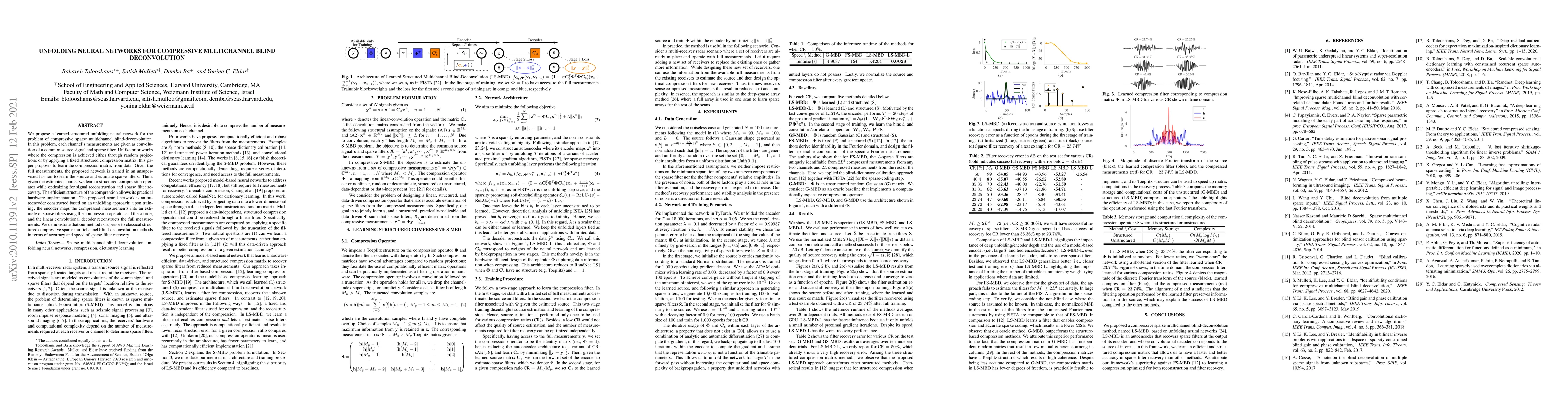 This paper proposes a learned-structured unfolding neural network for compressive sparse multichannel blind deconvolution, learning the compression matrix from data to improve accuracy and speed of sparse filter recovery compared to classical methods. The network is an autoencoder that maps compressed measurements to sparse filters and reconstructs full measurements efficiently.