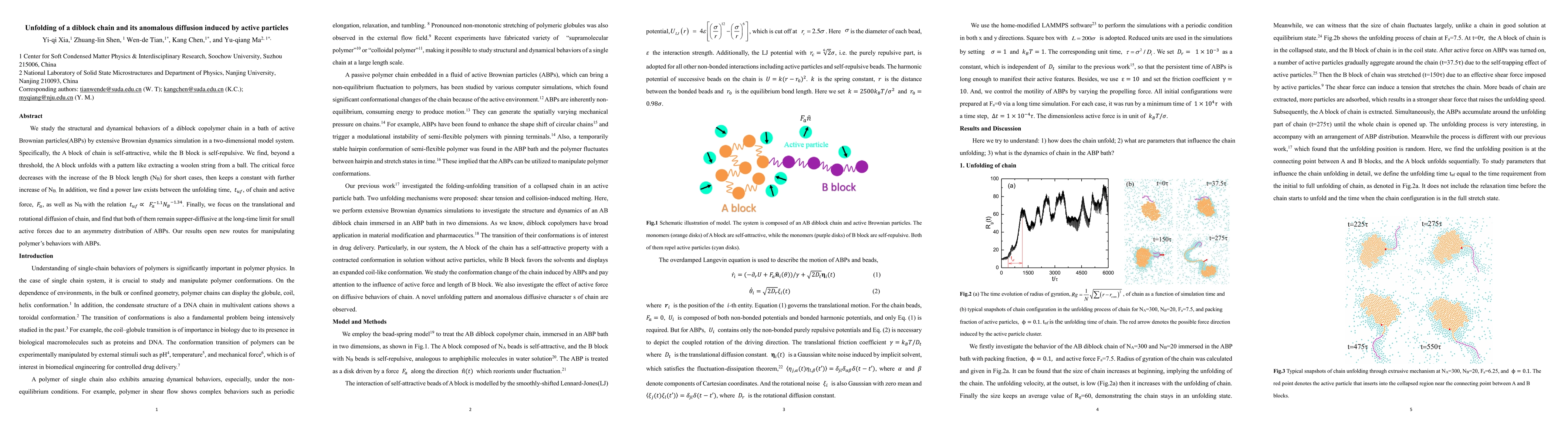 We study the structural and dynamical behaviors of a diblock copolymer chain in a bath of active Brownian particles (ABPs) by extensive Brownian dynamics simulation in a two-dimensional model system. Specifically, the A block of chain is self-attractive, while the B block is self-repulsive. We find, beyond a threshold, the A block unfolds with a pattern like extracting a woolen string from a ball. The critical force decreases with the increase of the B block length,NB, for short cases, then keeps a constant with further increase of NB. In addition, we find a power law exists between the unfolding time of chain and active force, Fa, as well as NB. Finally, we focus on the translational and rotational diffusion of chain, and find that both of them remain supper-diffusive at the long time limit for small active forces due to an asymmetry distribution of ABPs. Our results open new routes for manipulating polymer's behaviors with ABPs.