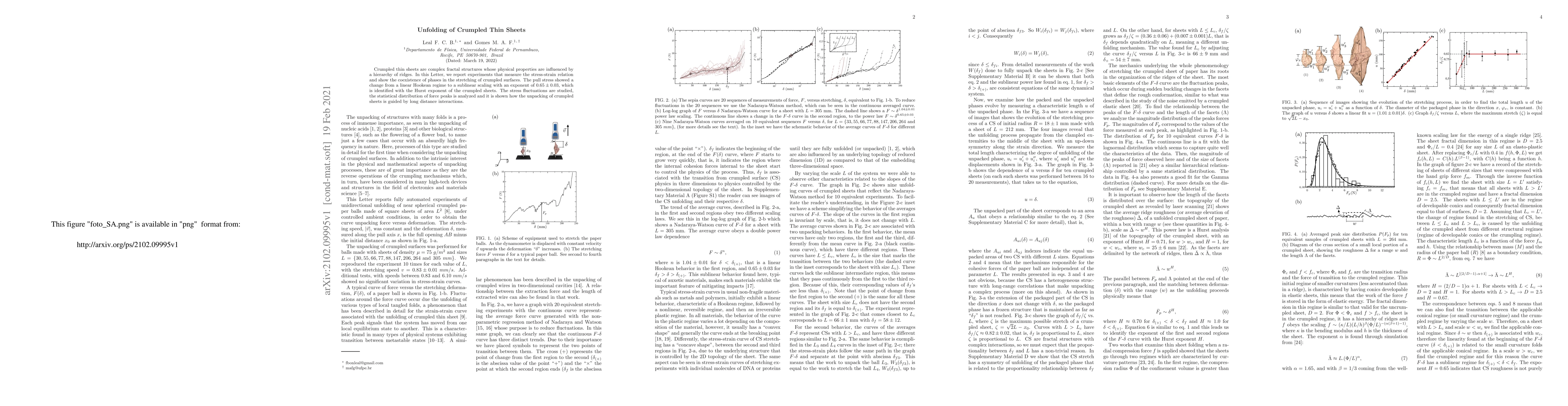 This research investigates the stress-strain relationship in crumpled thin sheets, revealing a transition from linear to sublinear scaling with an exponent of $0.65 \pm 0.03$. The study also highlights the role of long-distance interactions in guiding the unfolding process through the analysis of stress fluctuations and force peak distributions.