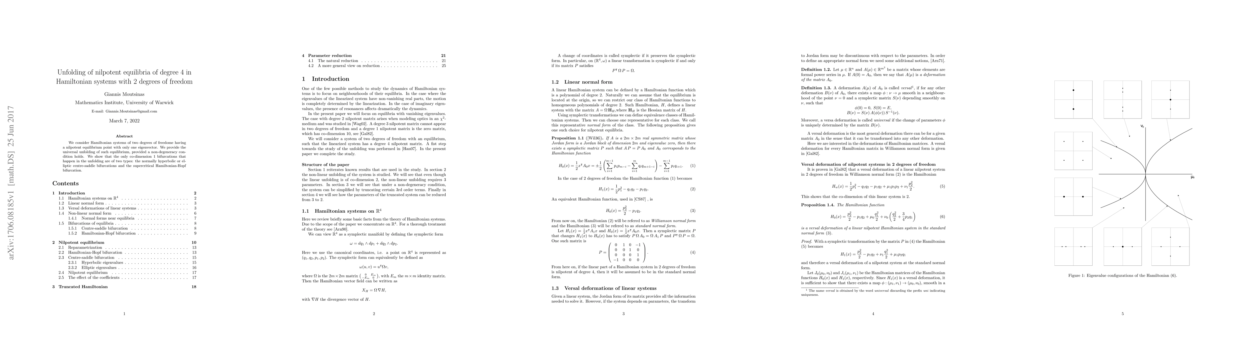 This paper studies the unfolding of nilpotent equilibria in 2D Hamiltonian systems, finding two types of bifurcations: centre-saddle and Hamiltonian-Hopf.