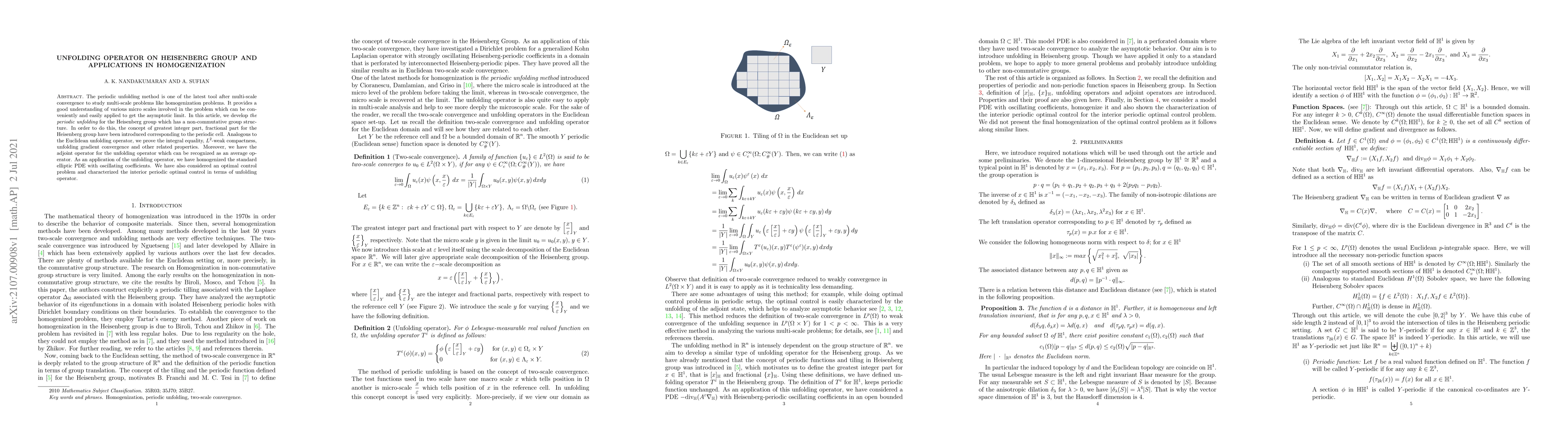 This paper develops the periodic unfolding method for the Heisenberg group, introducing concepts like the greatest integer and fractional parts for non-commutative structures. The study proves integral equality, $L^2$-weak compactness, and gradient convergence, and applies the unfolding operator to homogenize standard elliptic PDEs with oscillating coefficients and characterize interior periodic optimal control.