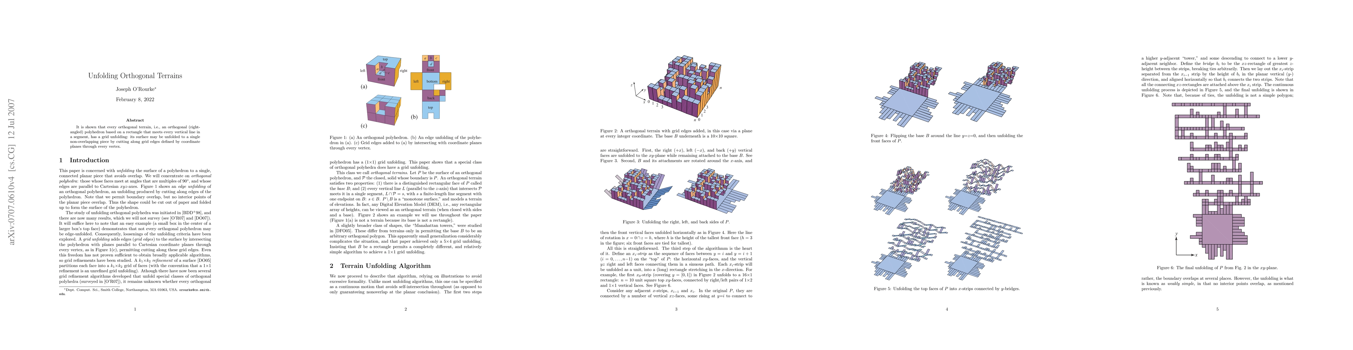 Summary: This paper demonstrates that any orthogonal terrain, a specific type of right-angled polyhedron based on a rectangle, can be unfolded into a single non-overlapping grid piece by cutting along grid edges defined by coordinate planes passing through each vertex. This reveals a method for flattening the surface of such polyhedra.