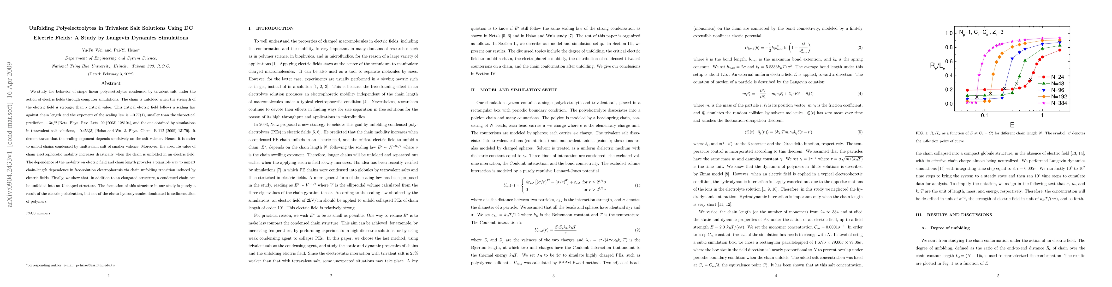 This study uses Langevin dynamics simulations to investigate the unfolding of linear polyelectrolytes in trivalent salt solutions under electric fields. The critical electric field for unfolding follows a scaling law with an exponent of $-0.77(1)$, which is lower than theoretical predictions and previous results in tetravalent salt solutions, indicating that lower valence salts more easily unfold polymer chains.