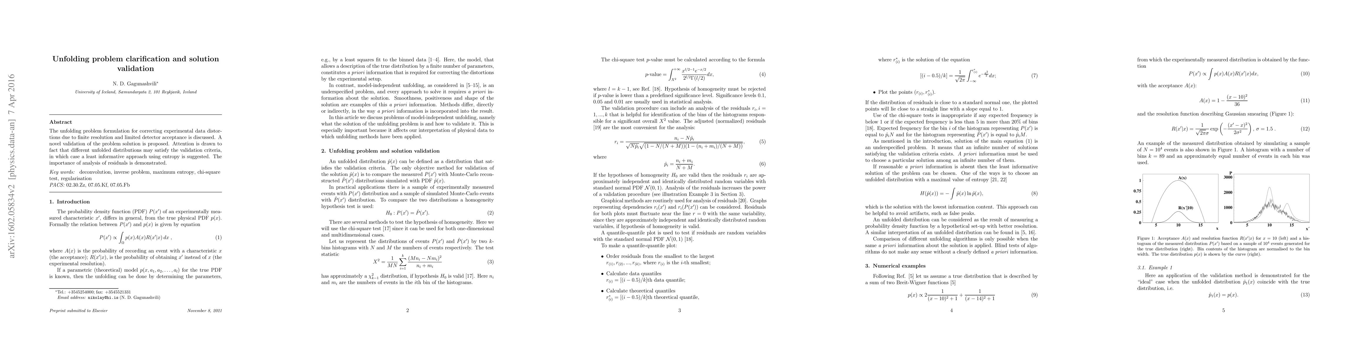 The unfolding problem formulation for correcting experimental data distortions due to finite resolution and limited detector acceptance is discussed. A novel validation of the problem solution is proposed. Attention is drawn to fact that different unfolded distributions may satisfy the validation criteria, in which case a conservative approach using entropy is suggested. The importance of analysis of residuals is demonstrated.