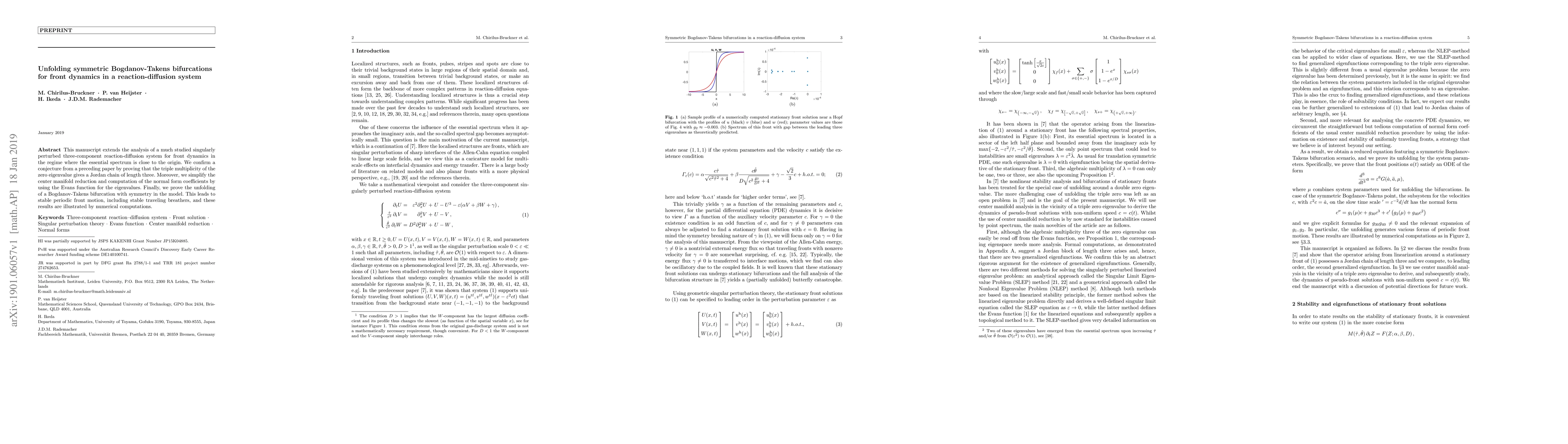 Researchers confirm a Bogdanov-Takens bifurcation with symmetry in a reaction-diffusion system, leading to stable periodic front motion including traveling breathers.