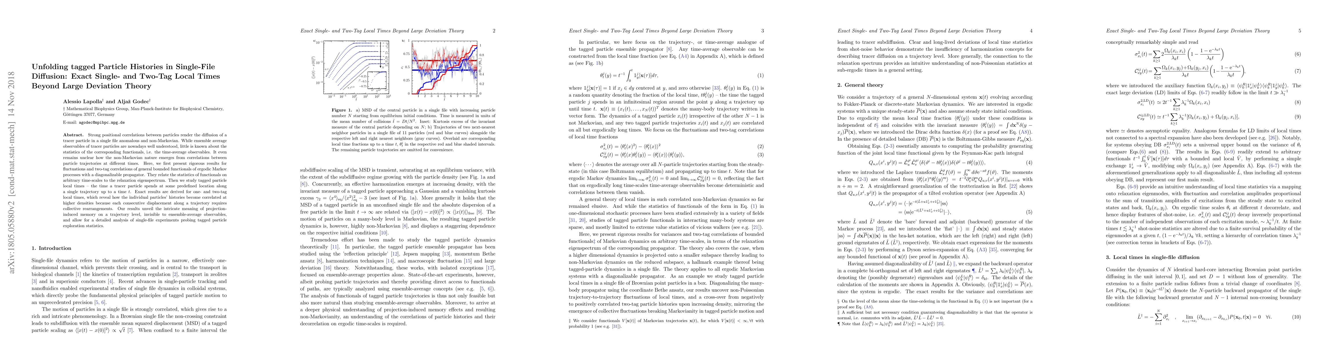Strong positional correlations between particles render the diffusion of a tracer particle in a single file anomalous and non-Markovian. While ensemble average observables of tracer particles are nowadays well understood, little is known about the statistics of the corresponding functionals, i.e. the time-average observables. It even remains unclear how the non-Markovian nature emerges from correlations between particle trajectories at different times. Here, we first present rigorous results for fluctuations and two-tag correlations of general bounded functionals of ergodic Markov processes with a diagonalizable propagator. They relate the statistics of functionals on arbitrary time-scales to the relaxation eigenspectrum. Then we study tagged particle local times -- the time a tracer particle spends at some predefined location along a single trajectory up to a time t. Exact results are derived for one- and two-tag local times, which reveal how the individual particles' histories become correlated at higher densities because each consecutive displacement along a trajectory requires collective rearrangements. Our results unveil the intricate meaning of projection-induced memory on a trajectory level, invisible to ensemble-average observables, and allow for a detailed analysis of single-file experiments probing tagged particle exploration statistics.