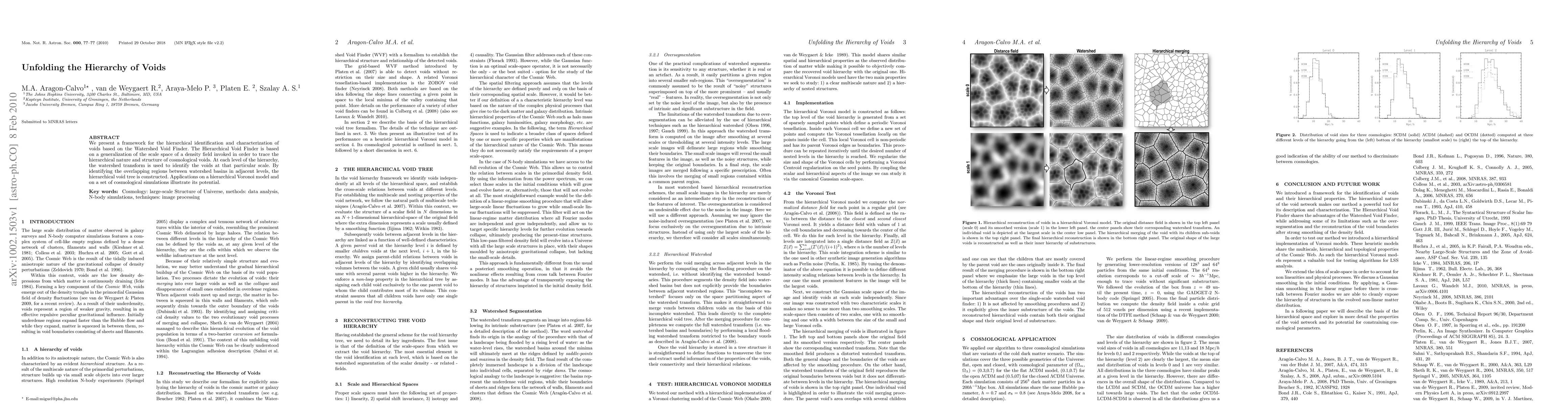 This paper introduces a framework for identifying and characterizing cosmological voids hierarchically using the Watershed Void Finder, which employs a scale-space density field and watershed transform to construct a hierarchical void tree. The method is demonstrated through applications on a hierarchical Voronoi model and cosmological simulations.
