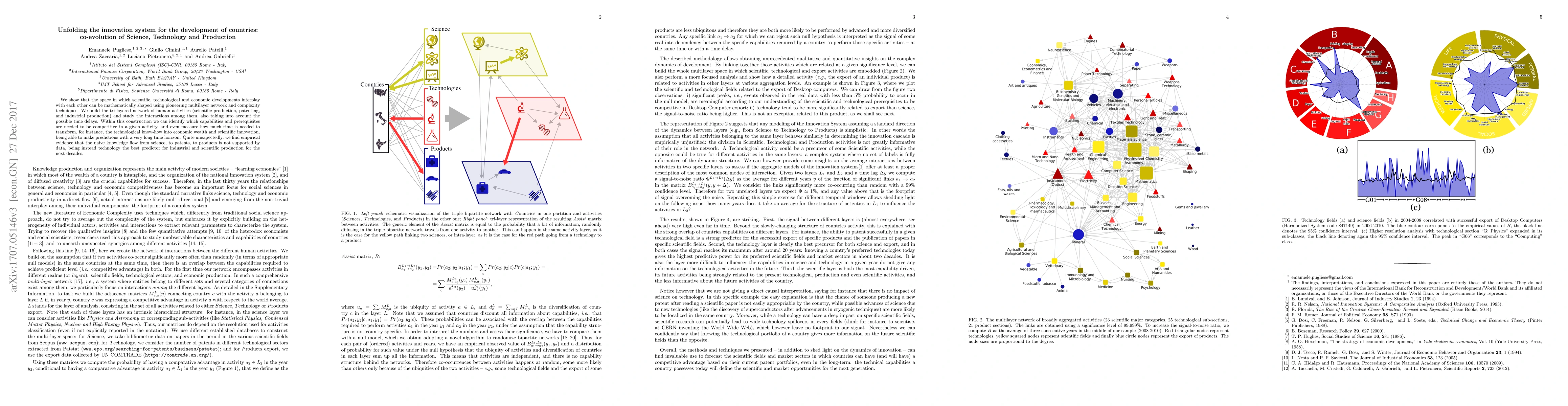 We show that the space in which scientific, technological and economic developments interplay with each other can be mathematically shaped using pioneering multilayer network and complexity techniques. We build the tri-layered network of human activities (scientific production, patenting, and industrial production) and study the interactions among them, also taking into account the possible time delays. Within this construction we can identify which capabilities and prerequisites are needed to be competitive in a given activity, and even measure how much time is needed to transform, for instance, the technological know-how into economic wealth and scientific innovation, being able to make predictions with a very long time horizon. Quite unexpectedly, we find empirical evidence that the naive knowledge flow from science, to patents, to products is not supported by data, being instead technology the best predictor for industrial and scientific production for the next decades.