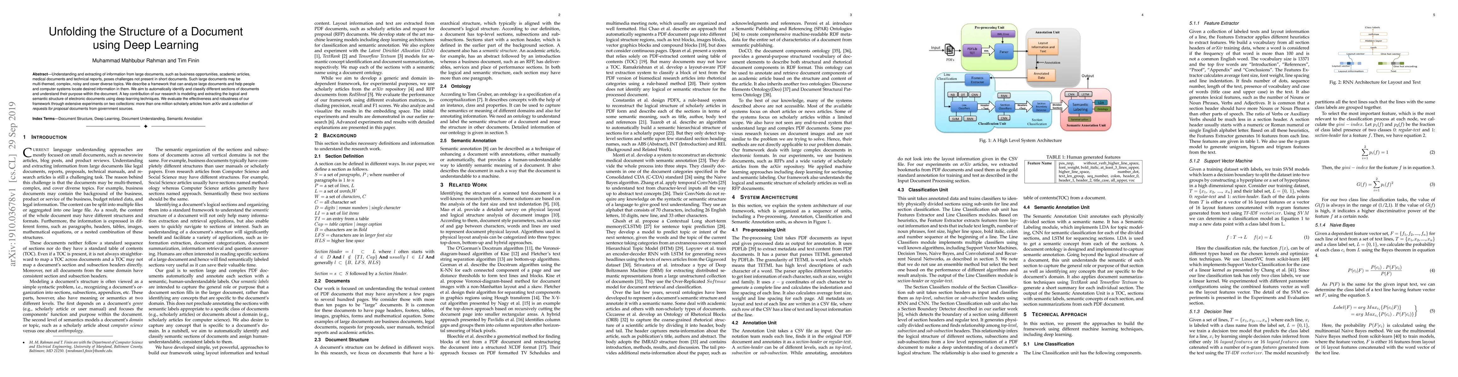 Understanding and extracting of information from large documents, such as business opportunities, academic articles, medical documents and technical reports, poses challenges not present in short documents. Such large documents may be multi-themed, complex, noisy and cover diverse topics. We describe a framework that can analyze large documents and help people and computer systems locate desired information in them. We aim to automatically identify and classify different sections of documents and understand their purpose within the document. A key contribution of our research is modeling and extracting the logical and semantic structure of electronic documents using deep learning techniques. We evaluate the effectiveness and robustness of our framework through extensive experiments on two collections: more than one million scholarly articles from arXiv and a collection of requests for proposal documents from government sources.