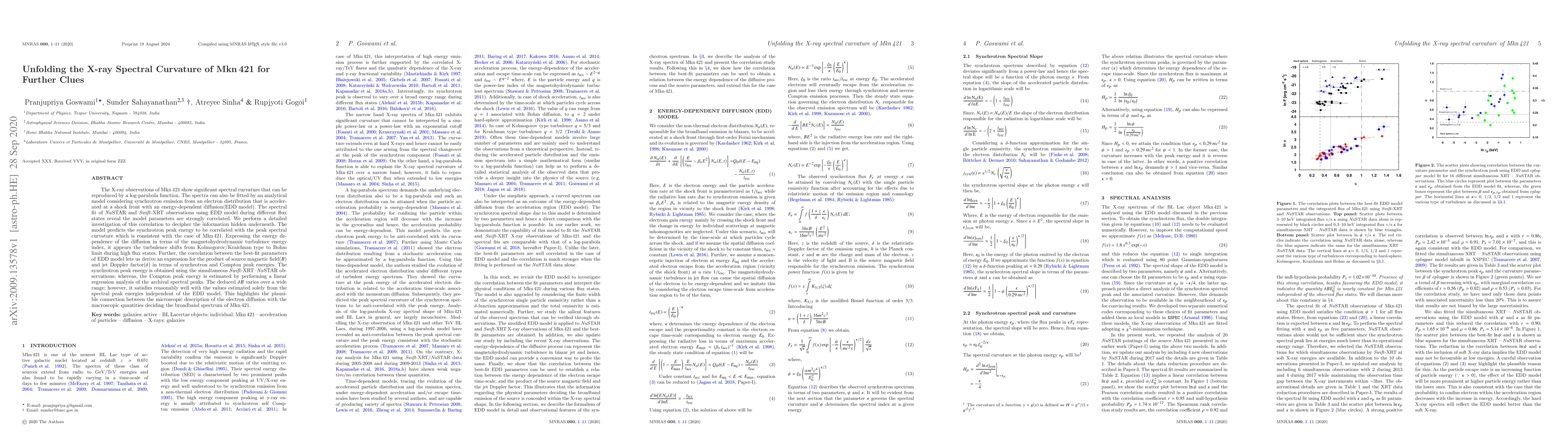 Researchers analyzed X-ray spectral data from Mkn 421 and found correlations between model parameters, including a possible connection between electron diffusion and broadband spectrum properties.