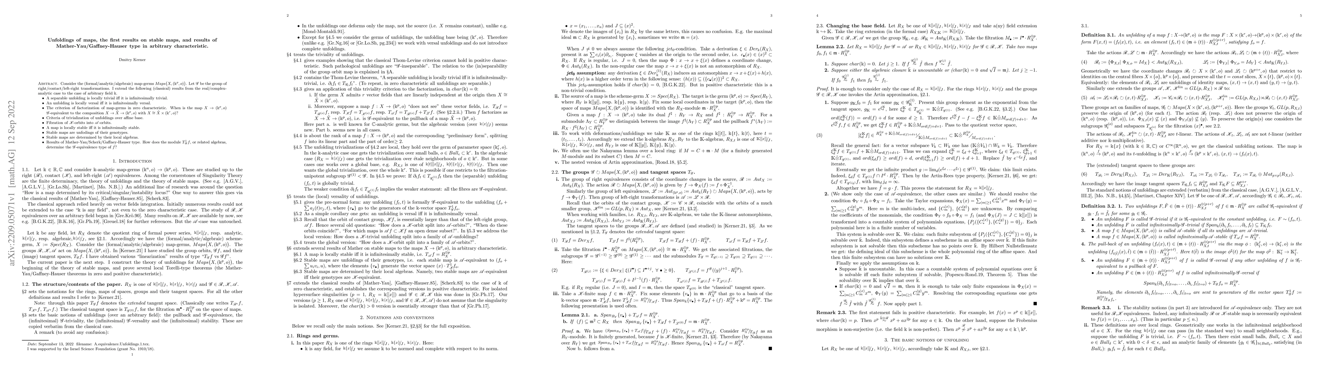 Consider the (formal/analytic/algebraic) map-germs Maps(X,(k^p,o)). Let G be the group of right/contact/left-right transformations. I extend the following (classical) results from the real/complex-analytic case to the case of arbitrary field k. * A separable unfolding is locally trivial iff it is infinitesimally trivial. * An unfolding is locally versal iff it is infinitesimally versal. * The criterion of factorization of map-germs in zero characteristic. * Criteria of trivialization of unfoldings over affine base. * Fibration of K-orbits into A-orbits. * A map is locally stable iff it is infinitesimally stable. * Stable maps are unfodings of their genotypes. * Stable maps are determined by their local algebras. * Results of Mather-Yau/Scherk/Gaffney-Hauser type. How does the module T^1_G f, or related algebras, determine the G-equivalence type of f?