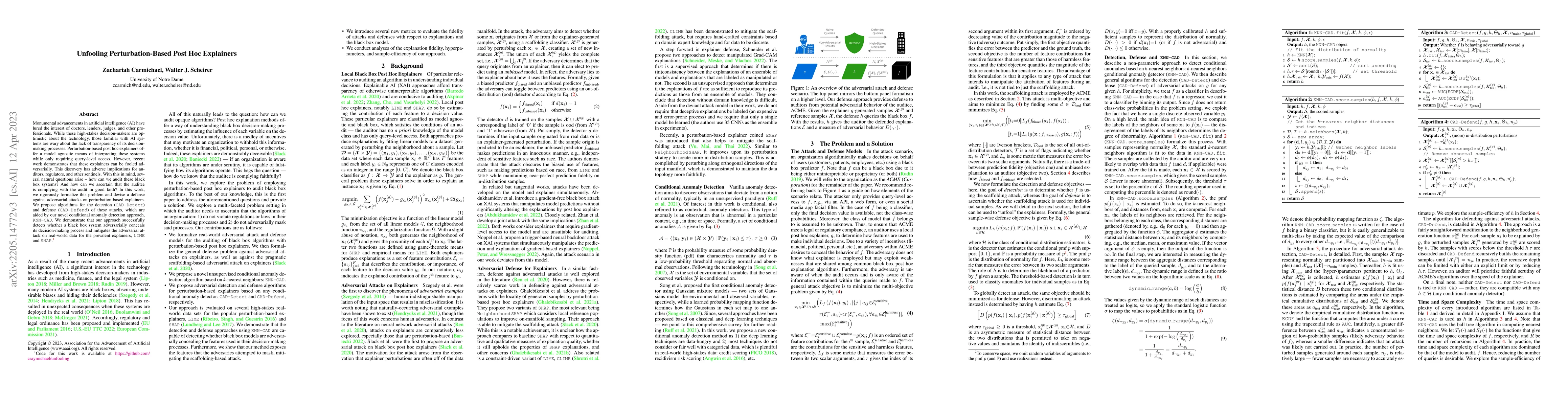 This paper addresses the vulnerability of perturbation-based post hoc explainers to adversarial attacks, proposing CAD-Detect and CAD-Defend algorithms to detect and defend against such attacks using a novel conditional anomaly detection approach, KNN-CAD. The study demonstrates the effectiveness of these methods in safeguarding black box systems from adversarial concealment of their decision-making processes.