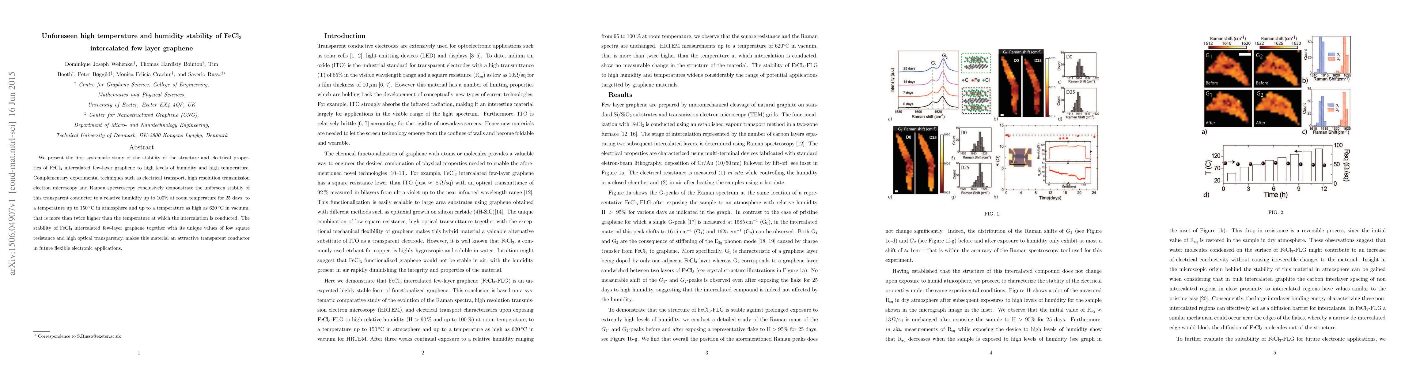 Researchers found that FeCl$_3$ intercalated few-layer graphene remains stable under high humidity (up to 100%) and temperatures up to 620°C for an extended period, making it a promising material for flexible electronic applications.