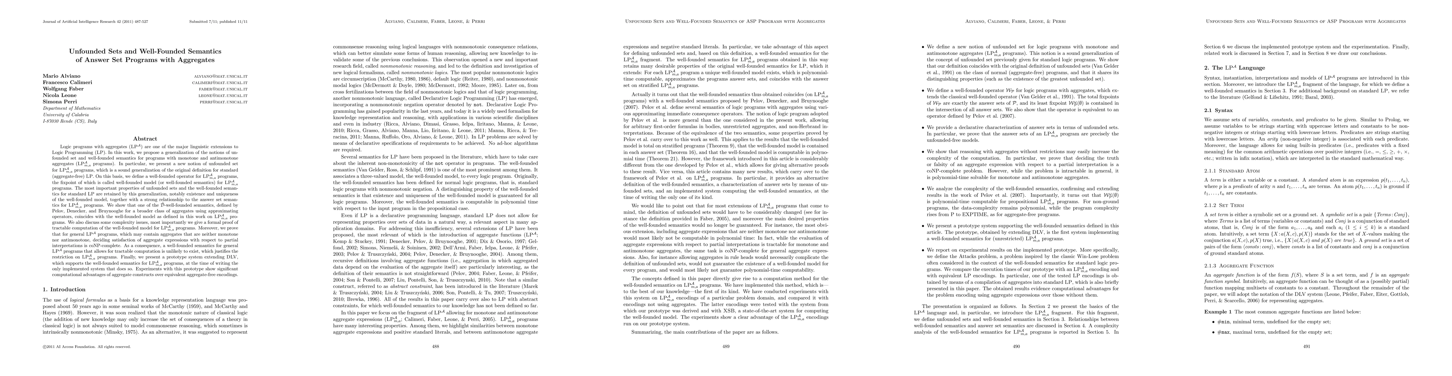 Logic programs with aggregates (LPA) are one of the major linguistic extensions to Logic Programming (LP). In this work, we propose a generalization of the notions of unfounded set and well-founded semantics for programs with monotone and antimonotone aggregates (LPAma programs). In particular, we present a new notion of unfounded set for LPAma programs, which is a sound generalization of the original definition for standard (aggregate-free) LP. On this basis, we define a well-founded operator for LPAma programs, the fixpoint of which is called well-founded model (or well-founded semantics) for LPAma programs. The most important properties of unfounded sets and the well-founded semantics for standard LP are retained by this generalization, notably existence and uniqueness of the well-founded model, together with a strong relationship to the answer set semantics for LPAma programs. We show that one of the D-well-founded semantics, defined by Pelov, Denecker, and Bruynooghe for a broader class of aggregates using approximating operators, coincides with the well-founded model as defined in this work on LPAma programs. We also discuss some complexity issues, most importantly we give a formal proof of tractable computation of the well-founded model for LPA programs. Moreover, we prove that for general LPA programs, which may contain aggregates that are neither monotone nor antimonotone, deciding satisfaction of aggregate expressions with respect to partial interpretations is coNP-complete. As a consequence, a well-founded semantics for general LPA programs that allows for tractable computation is unlikely to exist, which justifies the restriction on LPAma programs. Finally, we present a prototype system extending DLV, which supports the well-founded semantics for LPAma programs, at the time of writing the only implemented system that does so. Experiments with this prototype show significant computational advantages of aggregate constructs over equivalent aggregate-free encodings.