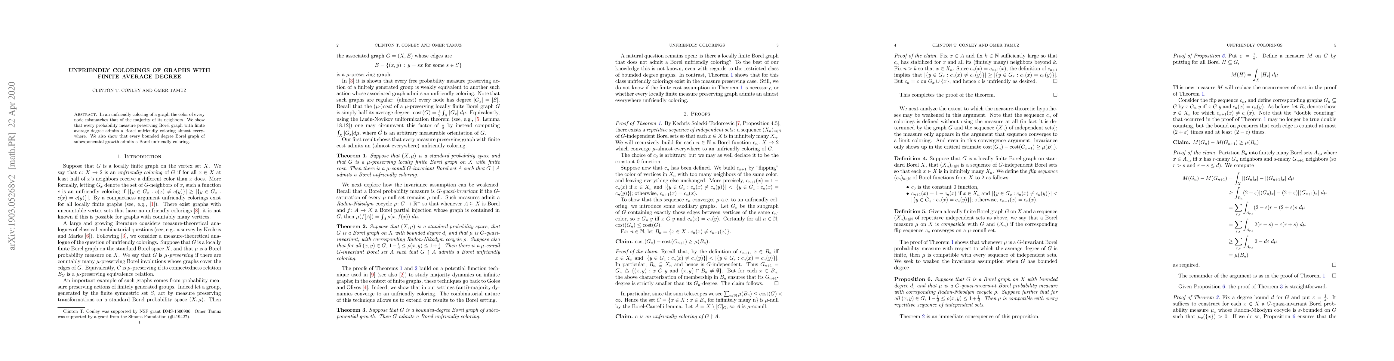 In an unfriendly coloring of a graph the color of every node mismatches that of the majority of its neighbors. We show that every probability measure preserving Borel graph with finite average degree admits a Borel unfriendly coloring almost everywhere. We also show that every bounded degree Borel graph of subexponential growth admits a Borel unfriendly coloring.