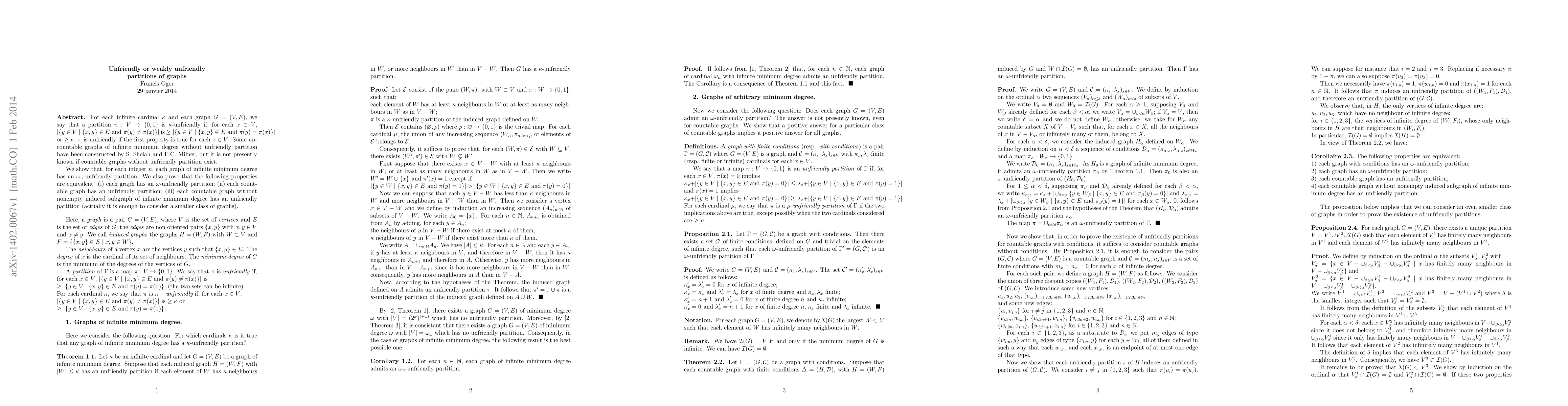 For each infinite cardinal $\kappa $ and each graph $G=(V,E)$, we say that a partition $\pi :V\rightarrow \left\{ 0,1\right\} $ is $\kappa $-unfriendly if, for each $x\in V$, $\left| \left\{ y\in V\mid \left\{ x,y\right\} \in E\text{ and }\pi (y)\neq \pi (x)\right\} \right| $ is $\geq \left| \left\{ y\in V\mid \left\{ x,y\right\} \in E\text{ and }\pi (y)=\pi (x)\right\} \right| $ or $\geq \kappa $; $\pi $ is unfriendly if the first property is true for each $x\in V$. Some uncountable graphs of infinite minimum degree without unfriendly partition have been constructed by S. Shelah and E.C. Milner, but it is not presently known if countable graphs without unfriendly partition exist. We show that, for each integer $n$, each graph of infinite minimum degree has an $\omega _{n}$-unfriendly partition. We also prove that the following properties are equivalent: (i) each graph has an $\omega $-unfriendly partition; (ii) each countable graph has an unfriendly partition; (iii) each countable graph without nonempty induced subgraph of infinite minimum degree has an unfriendly partition (actually it is enough to consider a smaller class of graphs).