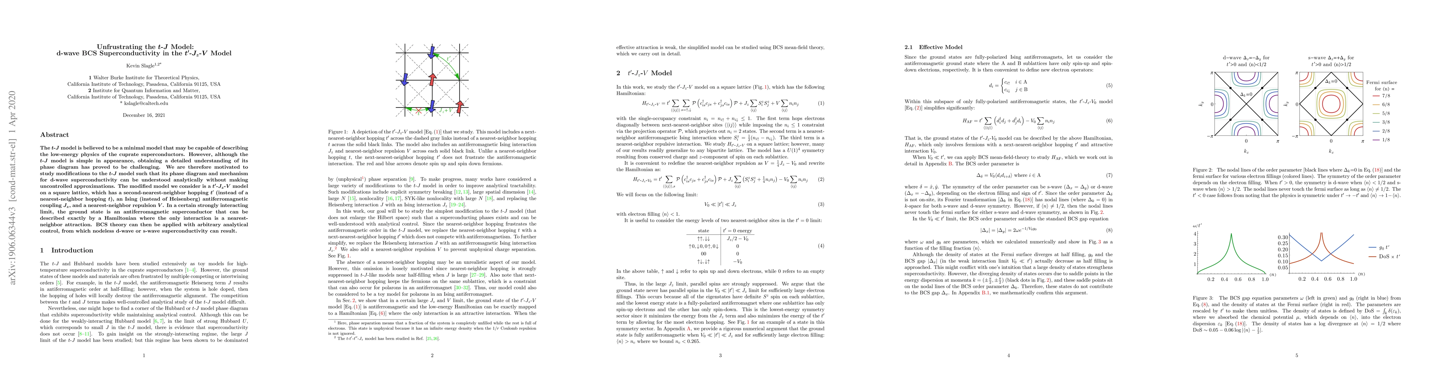 The t-J model is believed to be a minimal model that may be capable of describing the low-energy physics of the cuprate superconductors. However, although the t-J model is simple in appearance, obtaining a detailed understanding of its phase diagram has proved to be challenging. We are therefore motivated to study modifications to the t-J model such that its phase diagram and mechanism for d-wave superconductivity can be understood analytically without making uncontrolled approximations. The modified model we consider is a $t'$-$J_z$-$V$ model on a square lattice, which has a second-nearest-neighbor hopping $t'$ (instead of a nearest-neighbor hopping $t$), an Ising (instead of Heisenberg) antiferromagnetic coupling $J_z$, and a nearest-neighbor repulsion $V$. In a certain strongly interacting limit, the ground state is an antiferromagnetic superconductor that can be described exactly by a Hamiltonian where the only interaction is a nearest-neighbor attraction. BCS theory can then be applied with arbitrary analytical control, from which nodeless d-wave or s-wave superconductivity can result.