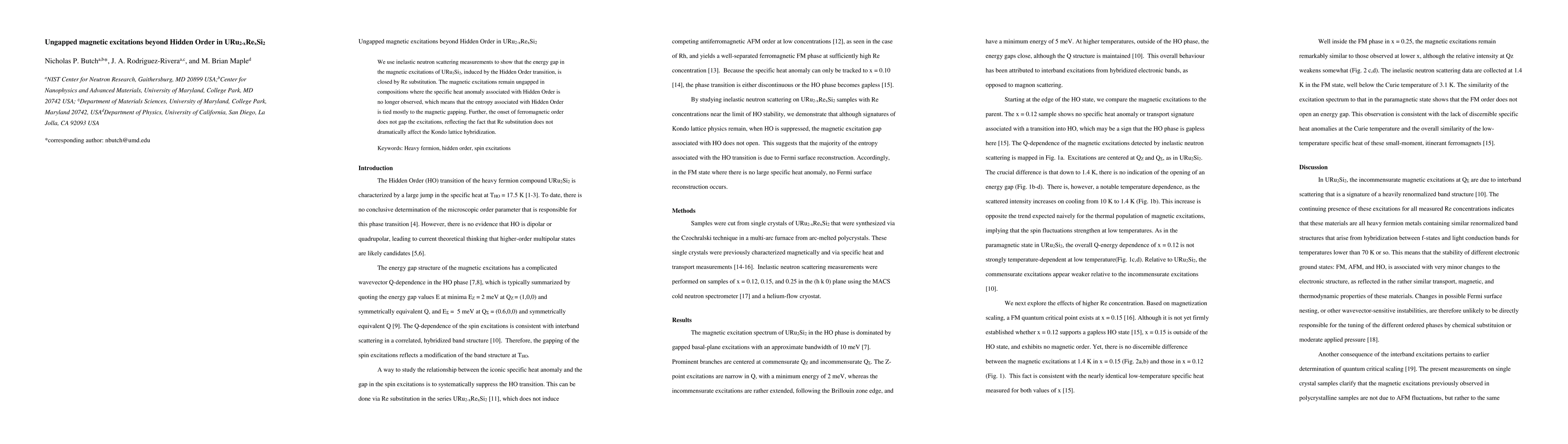 Researchers found that substituting Re into URu$_2$Si$_2$ closes the energy gap in magnetic excitations induced by Hidden Order, but does not affect the onset of ferromagnetic order or Kondo lattice hybridization.
