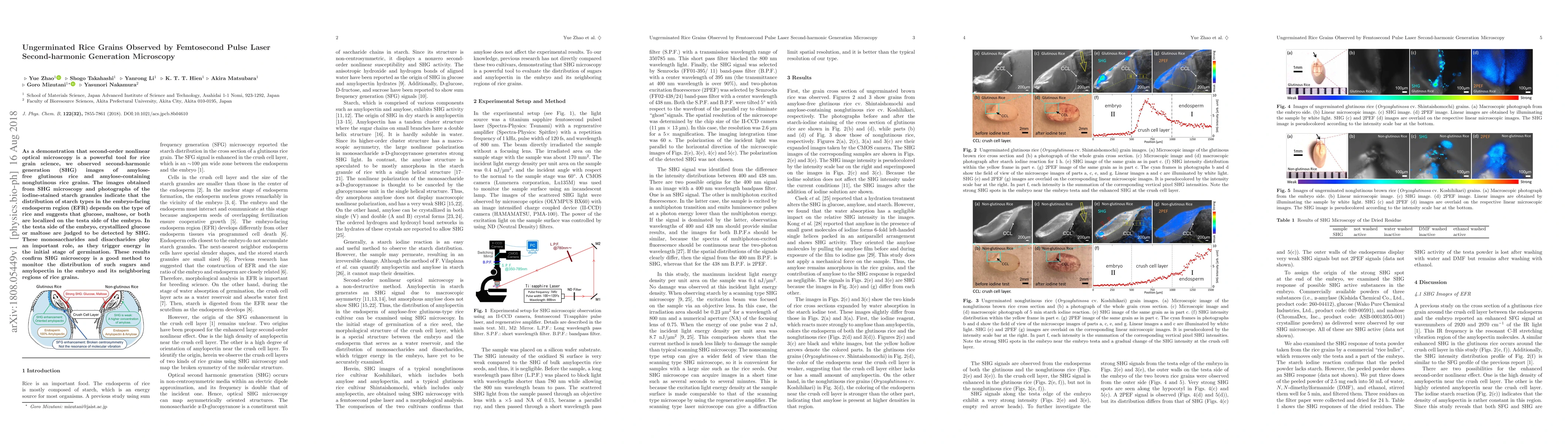 This study demonstrates the utility of second-harmonic generation (SHG) microscopy for observing the distribution of starch types in rice grains. The research reveals that SHG microscopy can effectively monitor the presence of glucose, maltose, and amylopectin, which are crucial for the initial stages of rice germination.